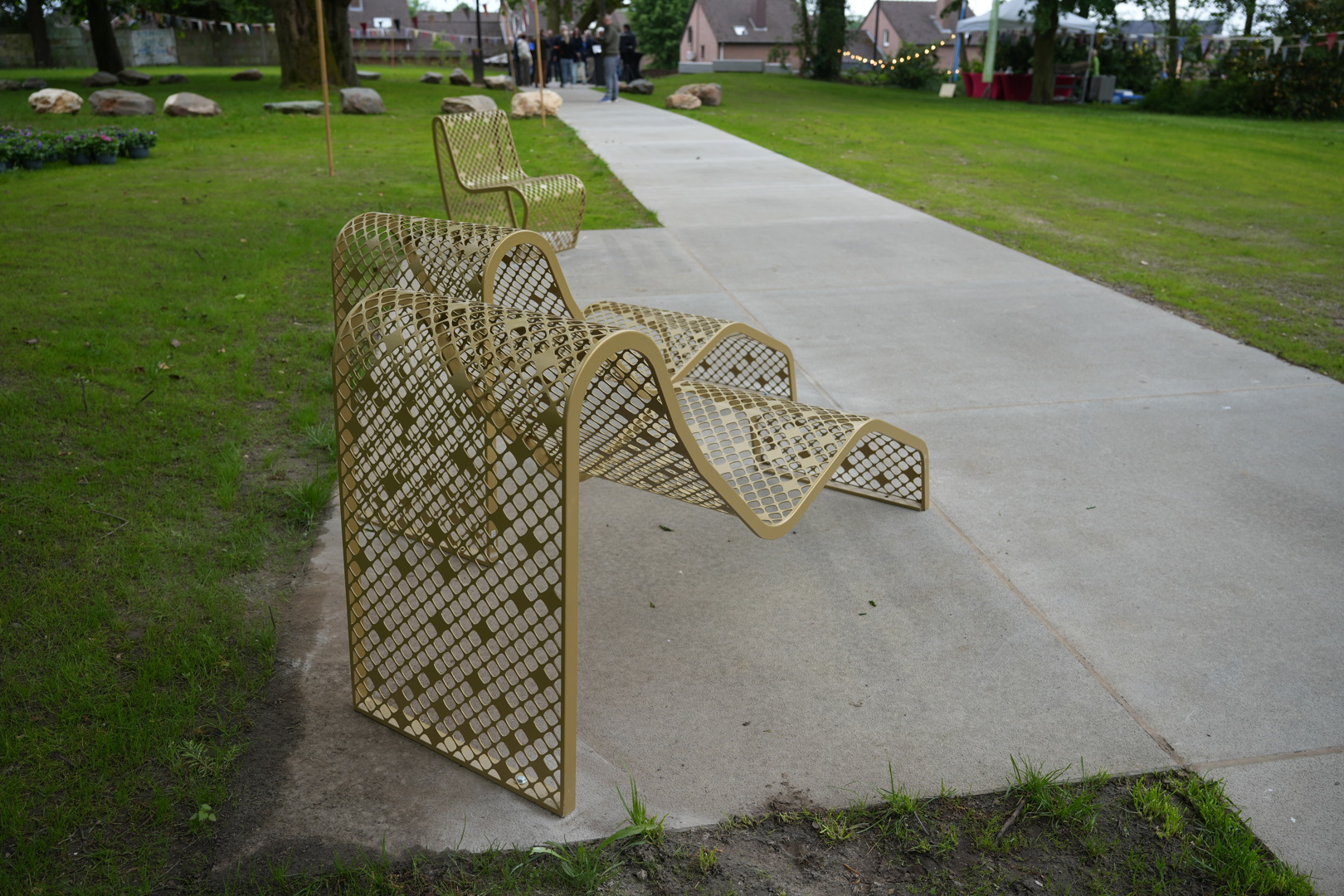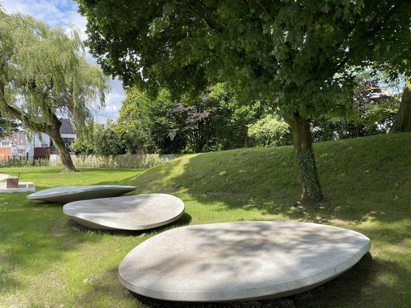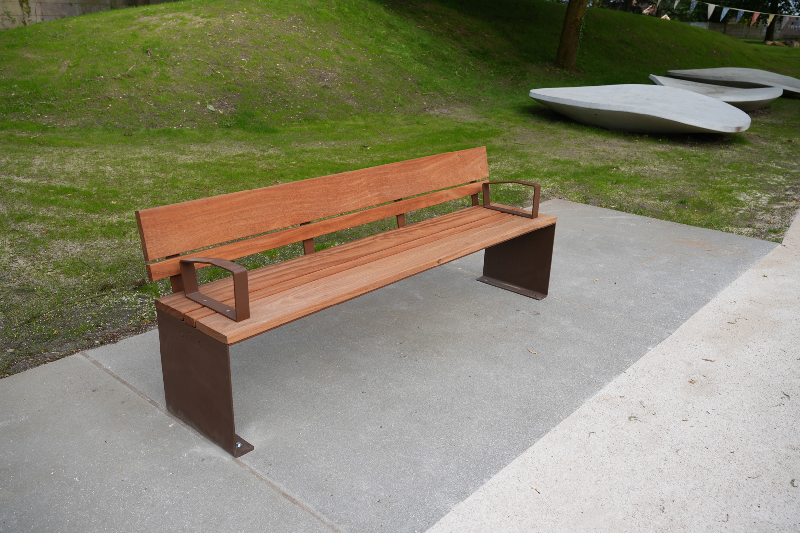 In het park vind je naast het wandelpad ook prefab betonnen meubilair. Bijzonder zijn de Núvol design zitschalen van de Spaanse fabrikant Durbanis en de langwerpige zitbanken van Ebema nv. Ook ecobeton water technologies leverde meubilair voor het park. Opvallend: niet uit beton, maar uit staal en hout. Luc Vandebeek verduidelijkt: “Het gaat om een zitbank van Cyria, een Franse fabrikant waar we nauw mee samenwerken. Op die manier kunnen we voor de inrichting van steden en gemeenten een totaalpakket aanbieden, waarbij we ons niet louter focussen op onze eigen prefab betonnen producten. Samen met de beste partners proberen we zo tot de beste oplossingen te komen.”