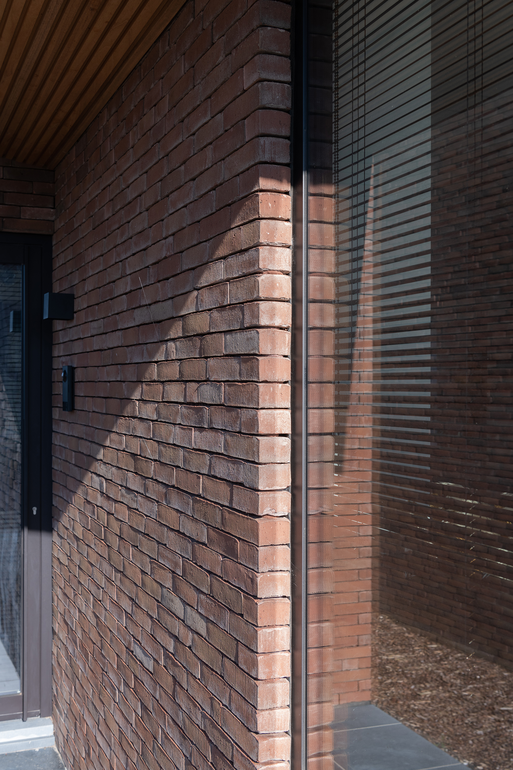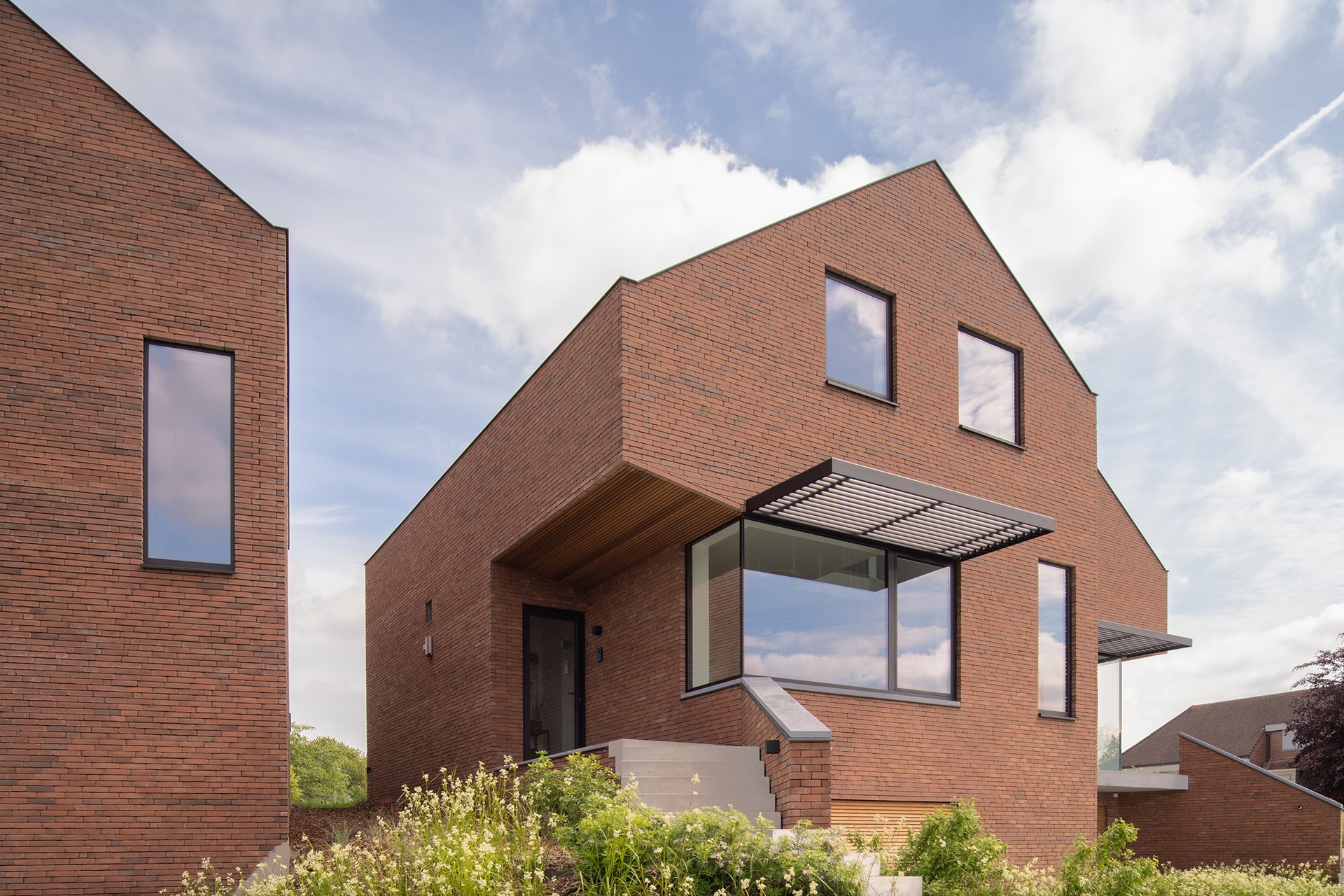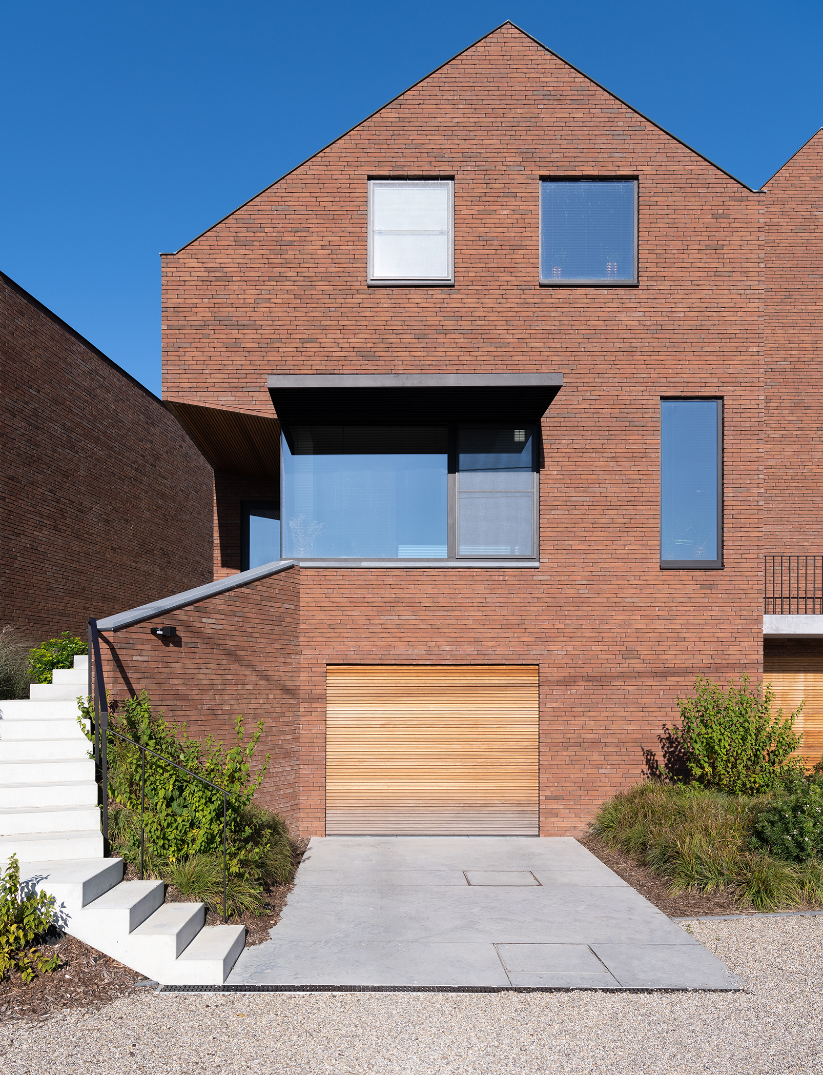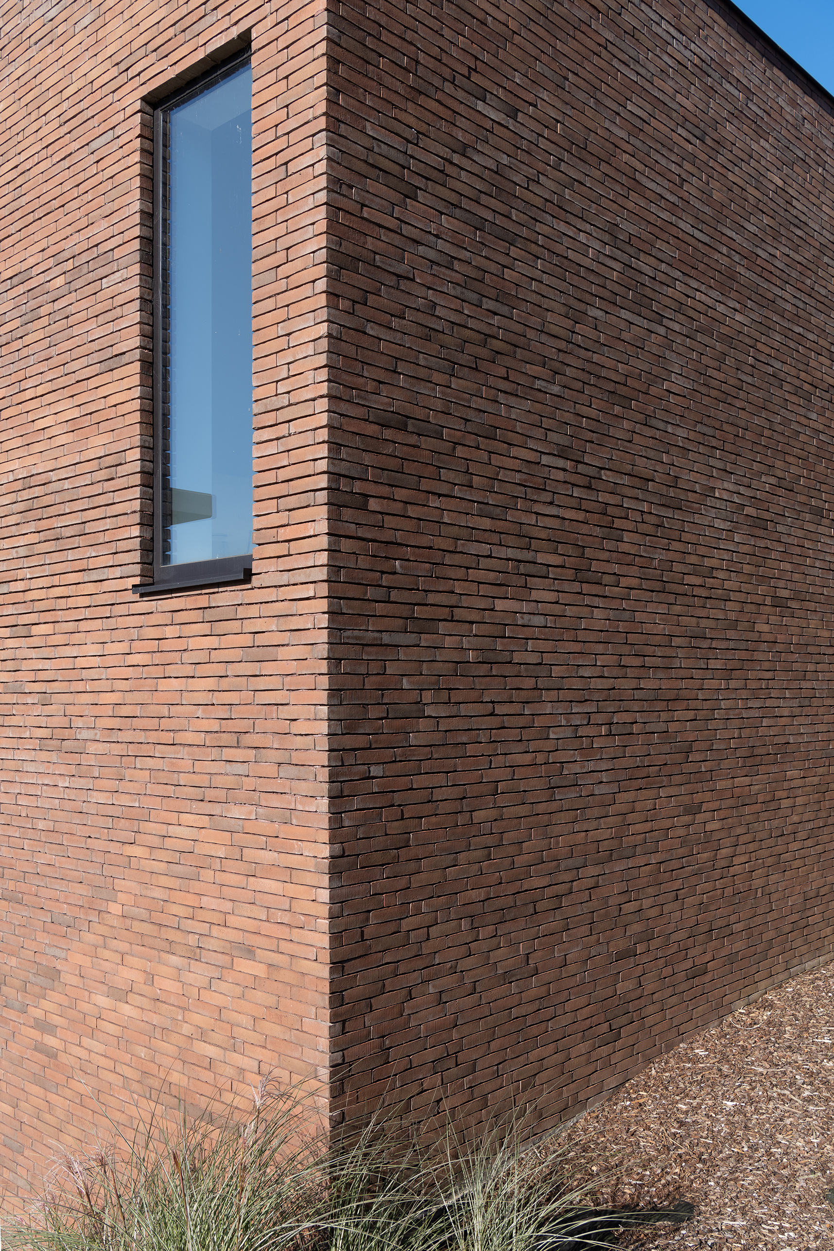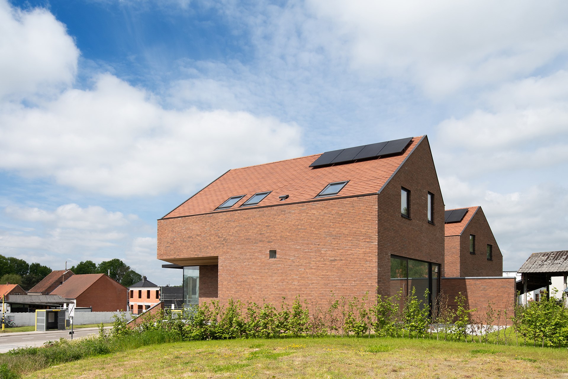 De sEptEm 3005 gevelsteen werd gecombineerd met een vlakke pan van Terreal. De toon op toon toepassing vormt een eenheid waarbij gevel en dak nagenoeg in elkaar over vloeien wat de archetypische huisjesvorm versterkt.