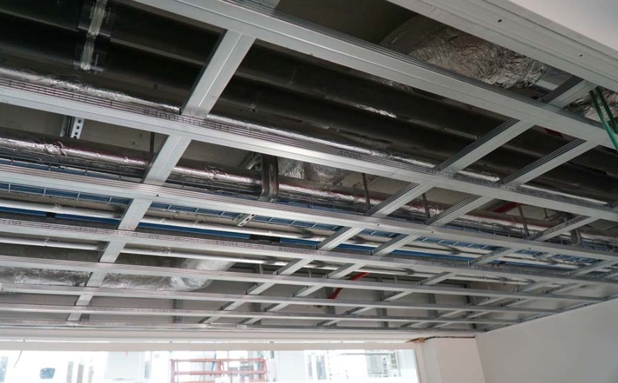 "Verder is er ook een metriek van 1m80 die terugkomt. De lijnen van de retombées moeten bijvoorbeeld overeenkomen met de positie van de lampen, alles steeds op dezelfde lijn. De architecten komen dat tweewekelijks nakijken. Het is een industrieel ontwerp met veel complexe details om tot een goed einde te brengen binnen de krappe timing van het project.”