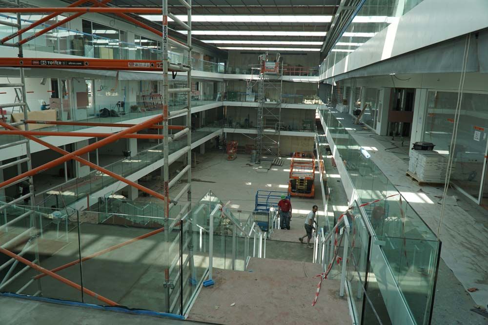 Dirk De Bruyne, projectleider bij Aluglas, het interieurbedrijf van de groep Houben: “Op dit moment zijn hier zes van onze mensen aan het werk,” vertelt hij. “Maar op de drukste momenten zijn we met twaalf. We plaatsen de brandwerende ramen en akoestische deuren met een schaduwvoeg van één centimeter. Die zie je overal terugkomen. De kunst is om alles mooi op die lijn van één centimeter aan te houden. Dat vraagt veel precisiewerk."