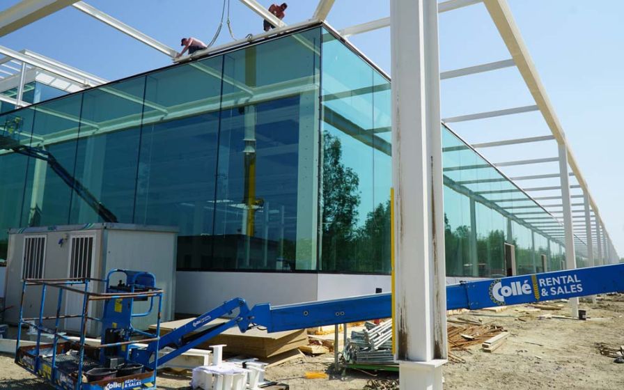 Dat het gebouw een unicum is met veel aandacht voor duurzaamheid en energieneutraliteit merk je aan de grote glaspartijen, vides en enorme overspanningen. Geert Michiels, projectleider bij Houben: “Omwille van de open structuur en de grote glaspartijen, hebben we hier TT-elementen van 12 m geplaatst en balken van 14m40 die 22 ton per stuk wegen. Als je daarbij nog eens de grote hoeveelheid aan technieken rekent, is het snel duidelijk dat dit een werf is waar we met de hele Groep Houben al onze krachten moeten bundelen om het beoogde resultaat te behalen.”