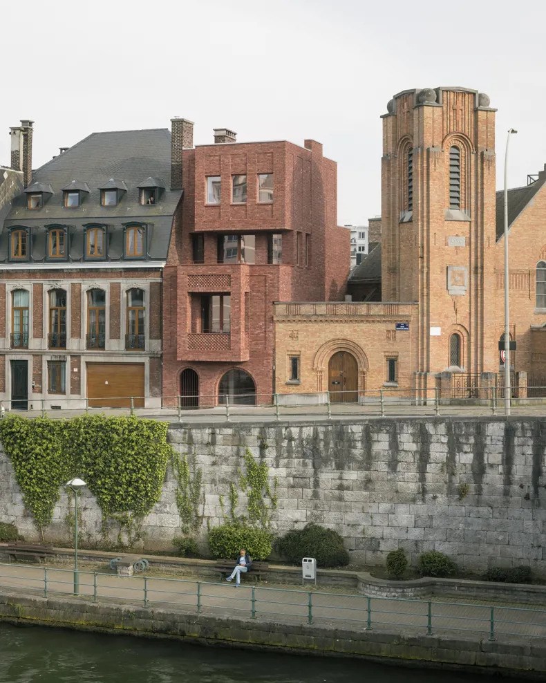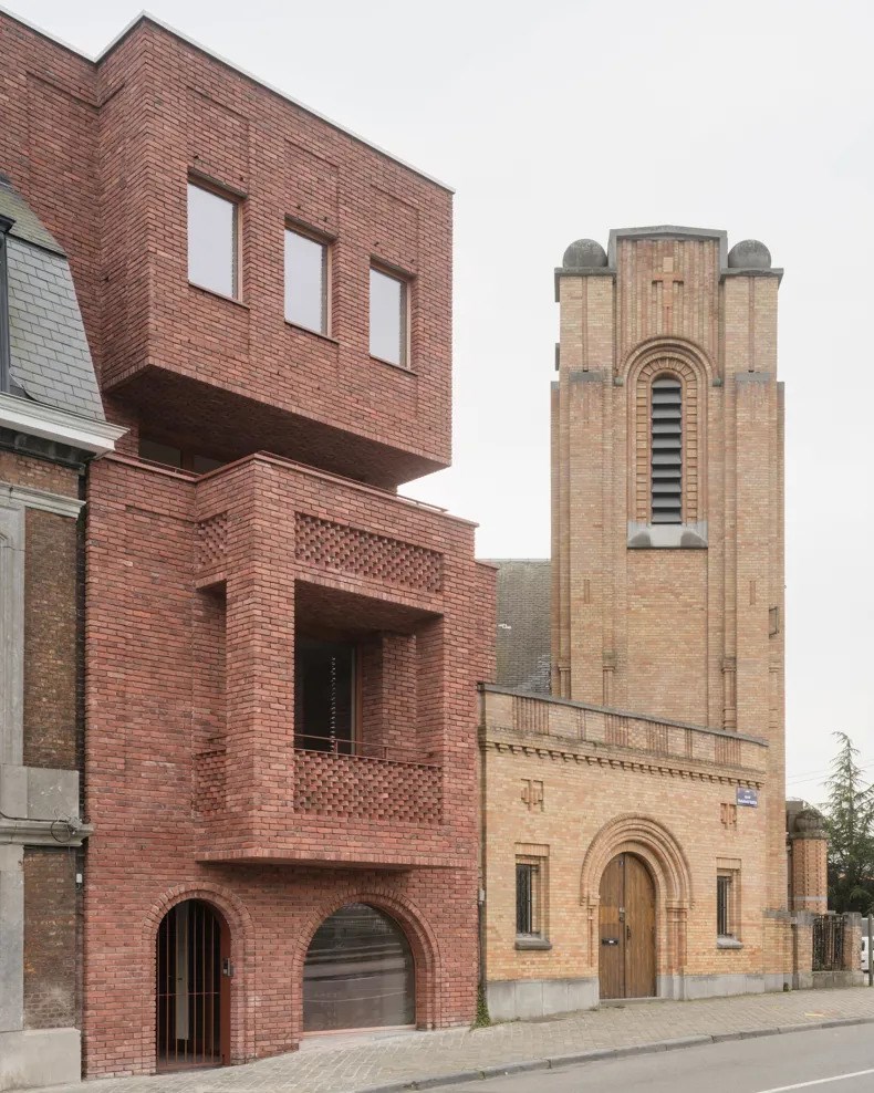 De locatie van dit huis maakt deel uit van een stedelijk weefsel dat in de 19e en het begin van de 20e eeuw is gebouwd. De omringende gebouwen, gekenmerkt door neoklassieke lijnen, bieden qua compositie duidelijke referenties: een kelder, een ritmische bakstenen gevel en elementen als een erker. De naburige protestantse kerk, met zijn art-decodetails, zorgt voor een modernere en grafischere esthetiek. De uitdaging was om een materiaal te vinden dat in staat was een dialoog aan te gaan met deze twee stijlen en tegelijkertijd zijn eigen identiteit te laten gelden.