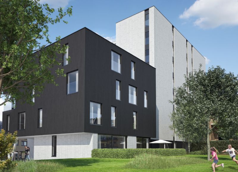Om de rankheid van de toren te behouden koos D&D voor een keramische steen als gevelbekleding. Dat is voor de architecten belangrijk bij een toren, de oorspronkelijke natuursteen zou het geheel een te zware, logge uitstraling geven. De keramische tegels van 60x120 worden opgehangen aan een aluminium frame en vervolgens met een chemisch anker verankerd. Momenteel zijn ze in volle onderhandelingen met de producent. Naast de ranke toren komt een lager volume uit donkere baksteen. Dat om de aansluiting met de bestaande woningen te verzekeren. De toren en het lager volume worden beide geplaatst op een gelijkvloerse verdieping die 1,2 meter hoger dan de straatkant ligt. Bram Nickmans: ”Hierdoor creëren we een Bel-etage. Dat vermindert de inkijk en verhoogt het wooncomfort voor de bewoners.”