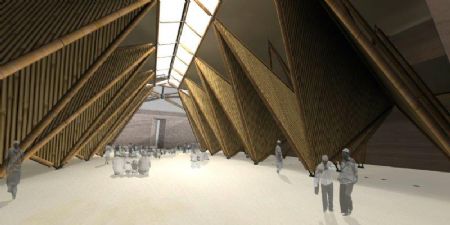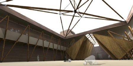 Binnenaanzicht: het dak wordt gedragen door een skelet van bamboe.
