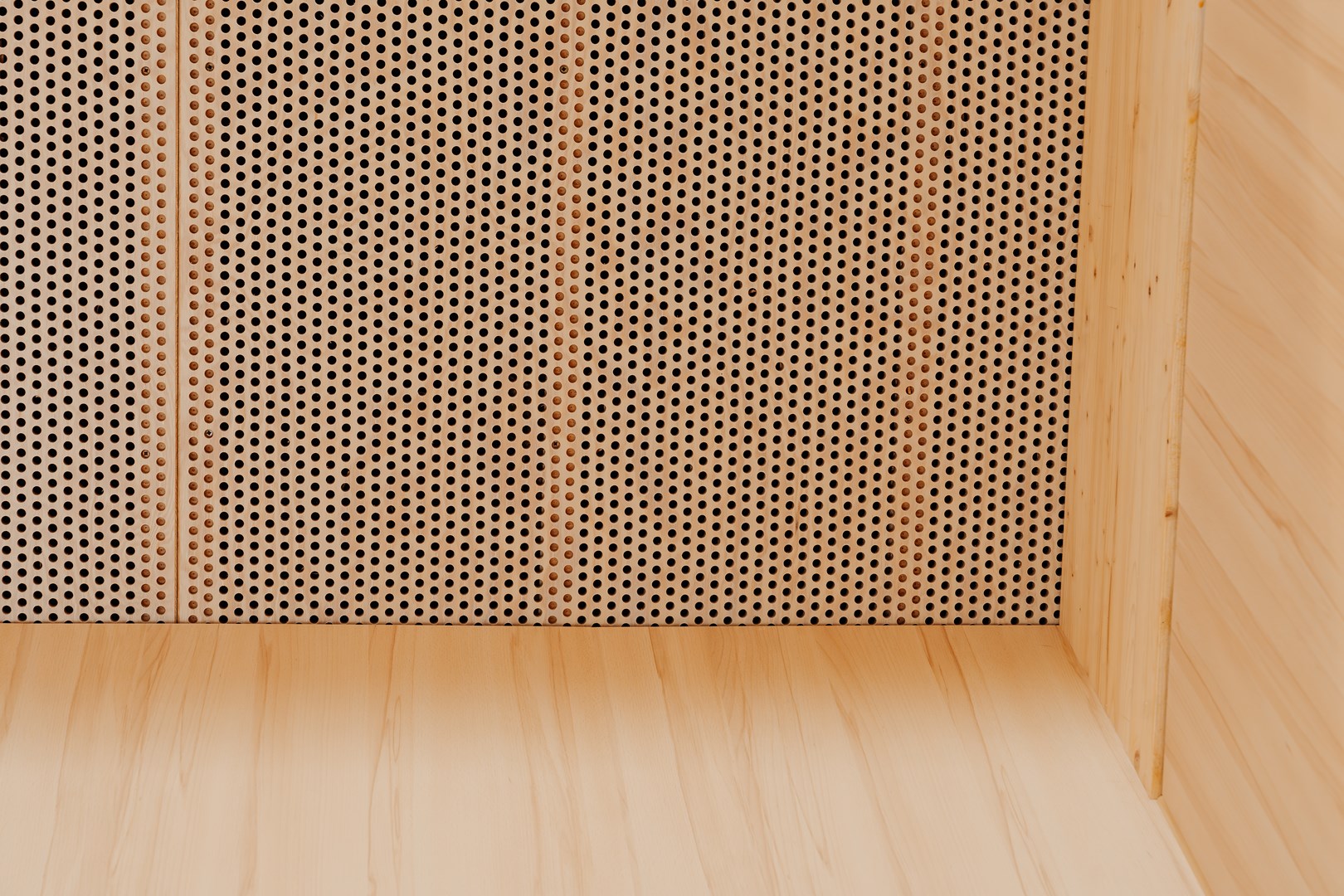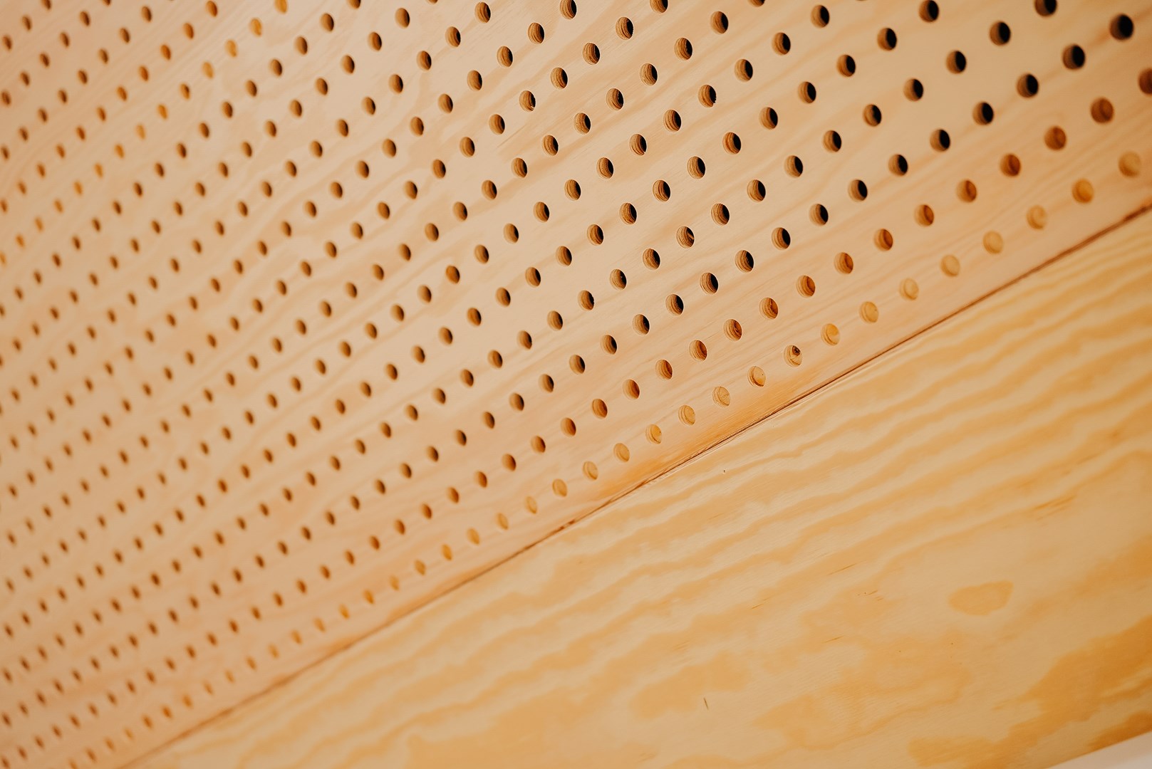 “Unilin biedt binnen dit gamma zelfs nog een derde soort akoestisch materiaal aan: houtwol. Daarbij gaat het niet om perforaties in de letterlijke zin van het woord, maar zijn de akoestische prestaties van het materiaal gelijkaardig. Je kan hierbij kiezen tussen een fijn en een superfijn patroon”, vertelt Benkö.