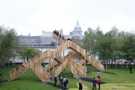 Endless Stair is een opvallend project. Je vindt deze 15 op elkaar aansluitende trappen, gemaakt van Amerikaans, dwars gelaagd tulpenhout en geïnspireerd door 'het trappenhuis' van M.C. Escher, op het grasveld voor het wereldberoemde Tate Modern museum. De constructie maakt deel uit van het London Design Festival 2013, één van Europa's belangrijkste, jaarlijkse design events. De installatie werd ontworpen door de Rijke Marsh Morgan Architects (dRMM) en gebouwd door Arup. Het is tegelijkertijd een kunstwerk en een onderzoek naar houttechnologie en duurzaamheid.
