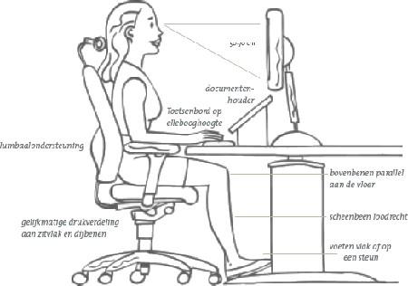Kies de zithoogte zodat u kan zitten met de voeten plat op de grond, en de knie- en enkelgewrichten onder een hoek van iets meer dan 90°. De zitdiepte stelt u best zo in dat uw bovenbenen over een maximale lengte ondersteund zijn en u tussen de voorzijde van de zitting en uw knieholten een vuistbreed ruimte heeft. De lendensteun van de rugleuning moet onderaan in de rugholte passen. Kies de hoogte van de armleggers zodat deze het gewicht van uw armen opvangen, en u kan zitten met ontspannen (niet opgetrokken) schouders.