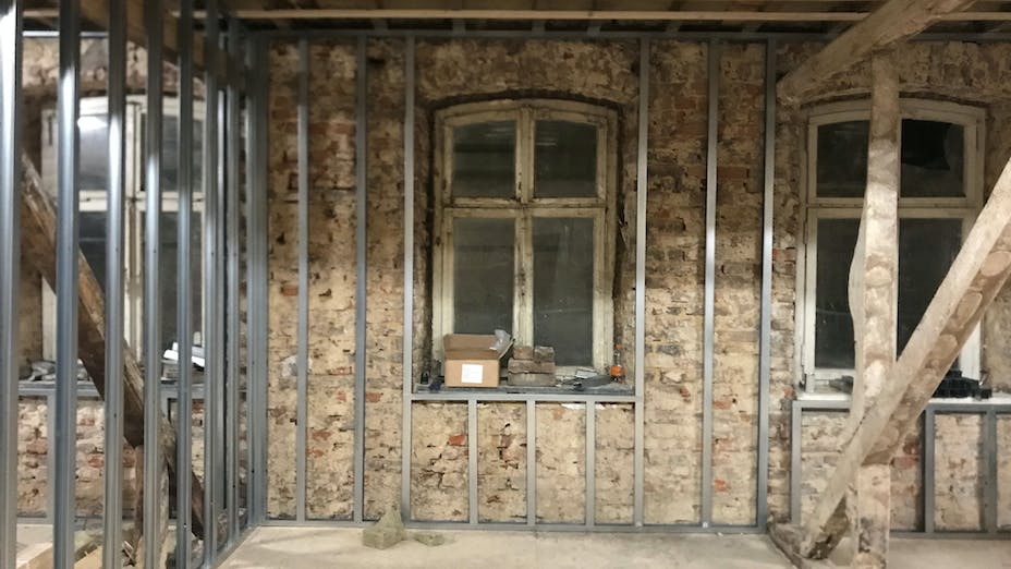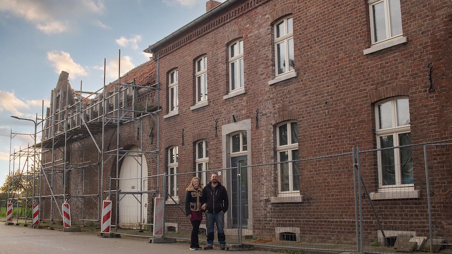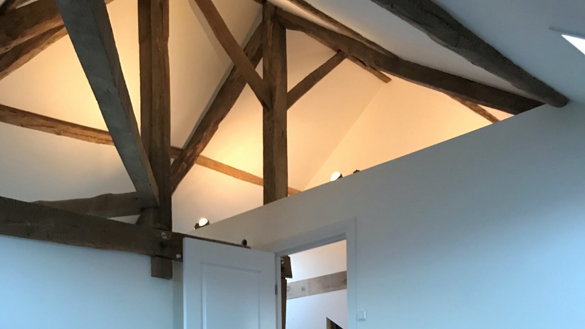 Wat deze klus vooral ingewikkeld maakte is dat de gemetselde buitengevel en de draagconstructie moeten voldoen aan de eisen en wensen van de Rijksdienst Cultureel Erfgoed. De dragende eikenhouten frames bijvoorbeeld worden verbonden met ouderwetse pen-gat verbindingen en voor de buitengevels is de ongelijkmatige veldbrandsteen voorgeschreven. Het vakwerk binnen werkt Tobias af met leemstuc. Het zijn technieken die zelfs een handige doe-het-zelver niet een-twee-drie in de vingers heeft, maar gaandeweg gaat het hem steeds beter af. Rianne vult aan: “We moeten een balans vinden tussen modern woongemak, duurzaamheid en behoud van authentieke materialen en elementen.”
