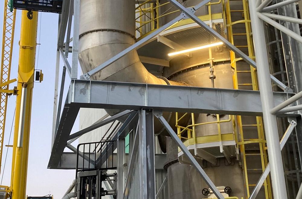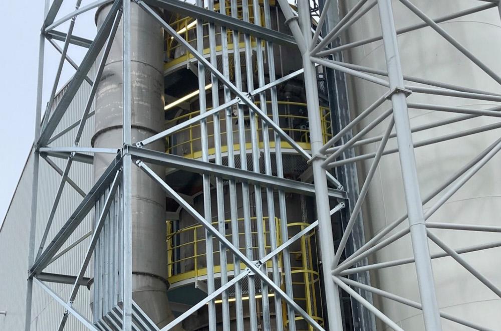 Nog uitdagender dan de ontwerpfase was de montage van de producten in dit project. Gezien de geringe ruimte rondom de installatie, de hoogte en de naastgelegen gebouwen was er zeer weinig ruimte om de werkzaamheden uit te voeren. Een deel van de omkasting was niet of nauwelijks met een hoogwerker te bereiken. Een aantal delen van de staalconstructie (14 meter lang) moesten over de installatie onder een bestaande leiding (Ø1400mm) worden geplaatst. Met behulp van SpalTech, gespecialiseerd in werken op hoogte en op moeilijk bereikbare plaatse met industriële touwtechnieken, zijn bepaalde delen van de omkasting uiteindelijk succesvol gemonteerd.