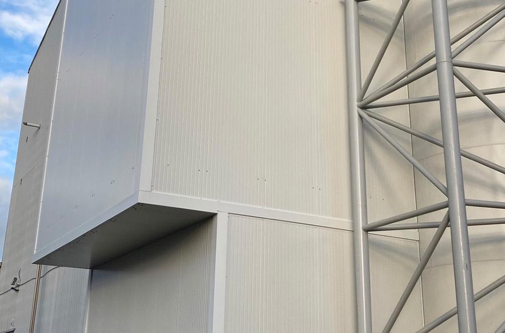 Nadat Merford de geluidsgegevens van de installatie hadden ontvangen en geanalyseerd, viel de keuze voor het Merford MSK100 paneel. Met daarbij een op maat gemaakt ontwerp voor een geluidsisolerende deur en ventilatiesysteem. Het ontwerp voor de omkasting met ondersteunende staalconstructie is met behulp van een 3D-scan van de totale complexe omgeving tot stand gekomen.