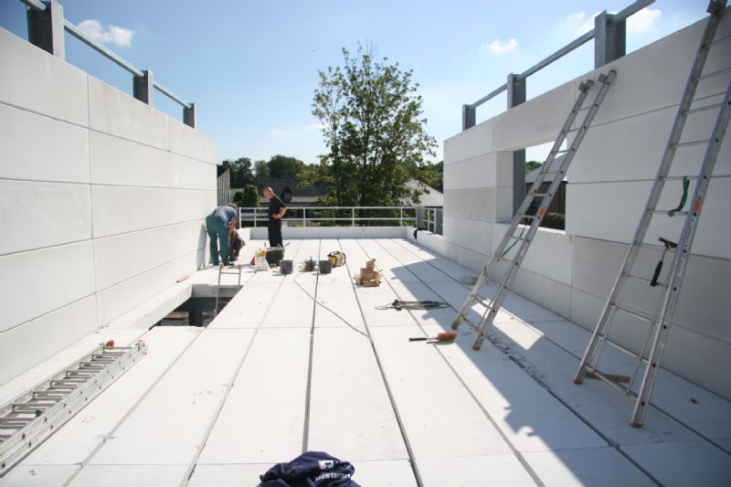 Cellenbeton, een lichte, met luchtporiën gevulde betonsoort, is een andere mogelijkheid. In ons land is het materiaal vooral bekend onder de naam Ytong. Het heeft verschillende goede eigenschappen, zo is het een heel licht materiaal dat geen druklaag nodig heeft op de welfsels. Daarbij worden de vloeren verlijmd aan de muurblokken, waardoor ze perfect luchtdicht zijn. Die verlijming zorgt er ook voor dat het gebouw heel snel recht staat. Het gebouw moet zonder mortel immers niet drogen, waardoor u een cascowoning (een water- en winddichte woning) in één dag kunt afwerken. De belangrijkste eigenschap van cellenbeton is echter de hoge isolatiewaarde van het materiaal, wat het te danken aan de kleine luchtbellen in zijn structuur. De lambdawaarde is bij de laagste op de markt. Door muren en vloeren in cellenbeton te combineren vermijdt u daarnaast ook bouwknopen en extra bouwfysische problemen. Een laatste voordeel is de prijs. Bijkomende isolatie is niet nodig, wat materiaalkosten en werkuren uitspaart. Het lichte gewicht van de vloeren maakt dat u ook minder moet investeren in de dragende structuur.