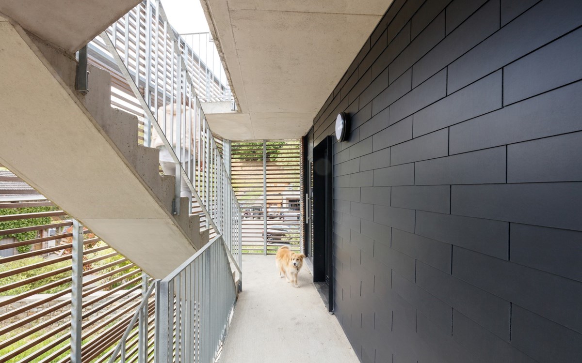 Het gebouw in kwestie telt drie niveaus en herbergt op het gelijkvloers een dierenkliniek met de nodige kooien en een technische ruimte, die is ingegraven in het talud. De eerste verdieping biedt plaats aan een kine- en verzorgingsruimte, een klein kantoor en een achterliggend buitenterras (op het dak van de technische ruimte). Op de tweede verdieping is een appartement ingericht. Elk niveau staat op zichzelf en heeft een welbepaalde functie. De verticale circulatievoorzieningen bevinden zich aan de buitenkant van hoofdvolume, waardoor de verschillende gebruikers van het gebouw – dieren, personeel, klanten, conciërge – niet in elkaars vaarwater hoeven te komen. Meer foto's van dit project bekijken.