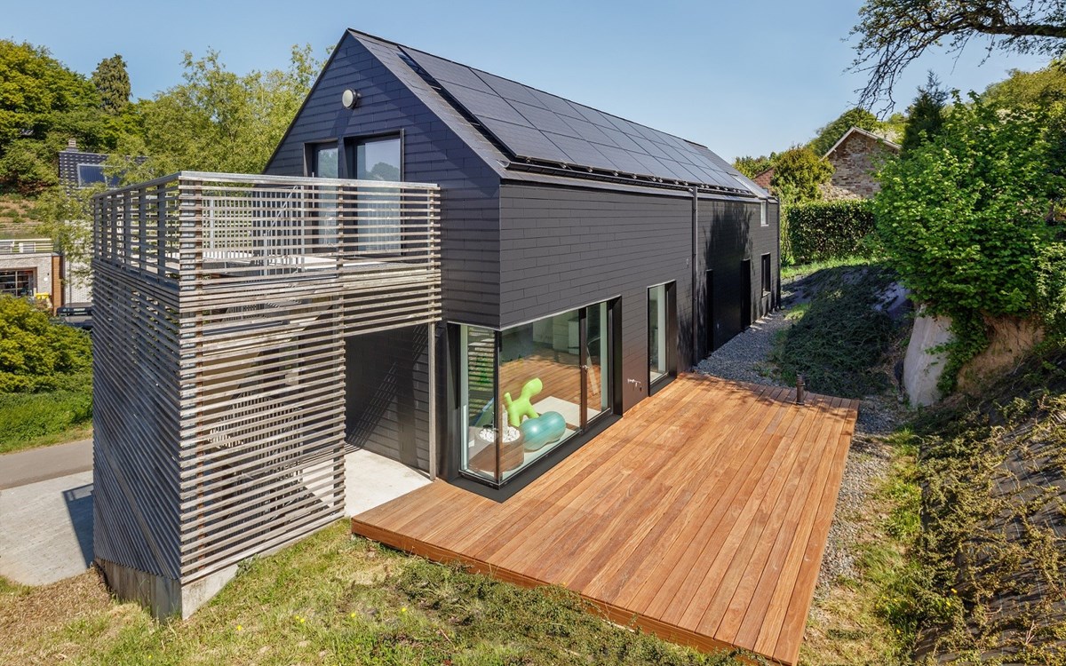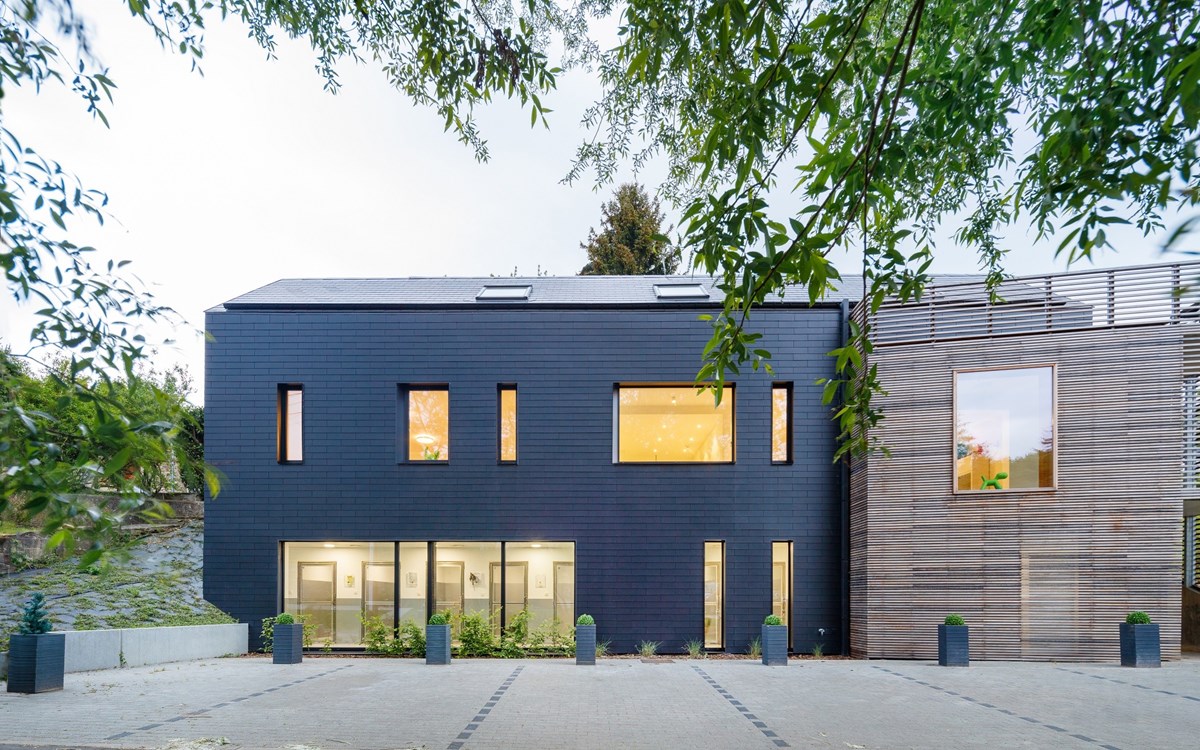 De zwarte Alterna-vezelcementlei bleek het ideale materiaal te zijn om de gevel van het hoofdvolume de beoogde allure te geven. Dankzij de specifieke plaatsingsmethode (halfsteensverband) accentueert ze de horizontale lijnen. Met hun strakke voorkomen en hun donkere tint sluiten de leien aan bij de minerale materialen in het straatbeeld, en dat op een economische en hedendaagsere manier. Marie Marcotty: «We hebben niet enkel voor vezelcementleien geopteerd vanwege de esthetiek, maar ook vanwege hun duurzaamheid.» Het regelmatige patroon van het materiaal geeft de gevels van het gebouw textuur, naar het beeld van een baksteen of een breuksteen. Ook de plaatser verdient een eervolle vermelding voor de piekfijne uitvoering.