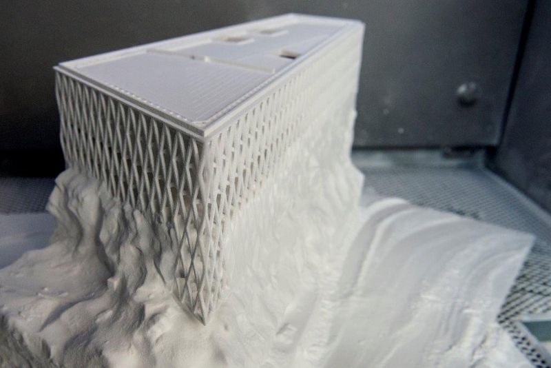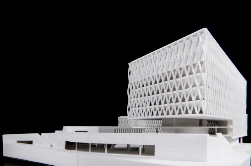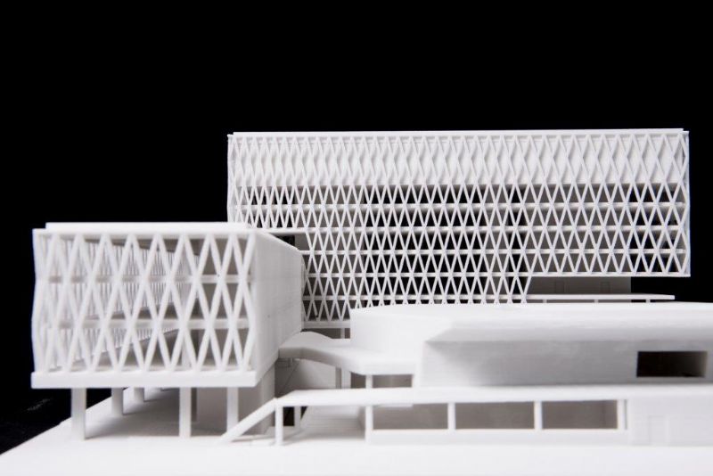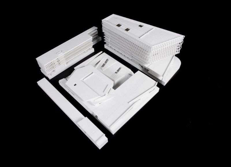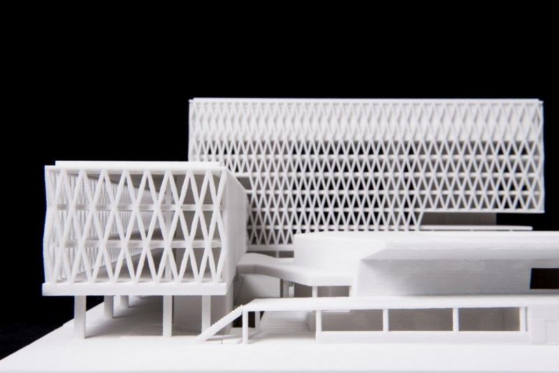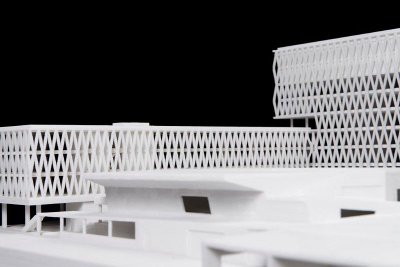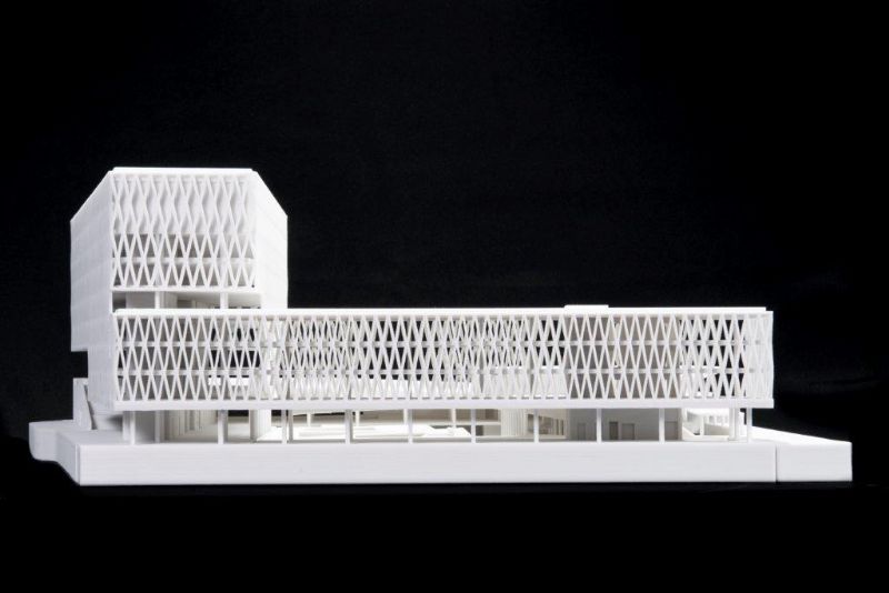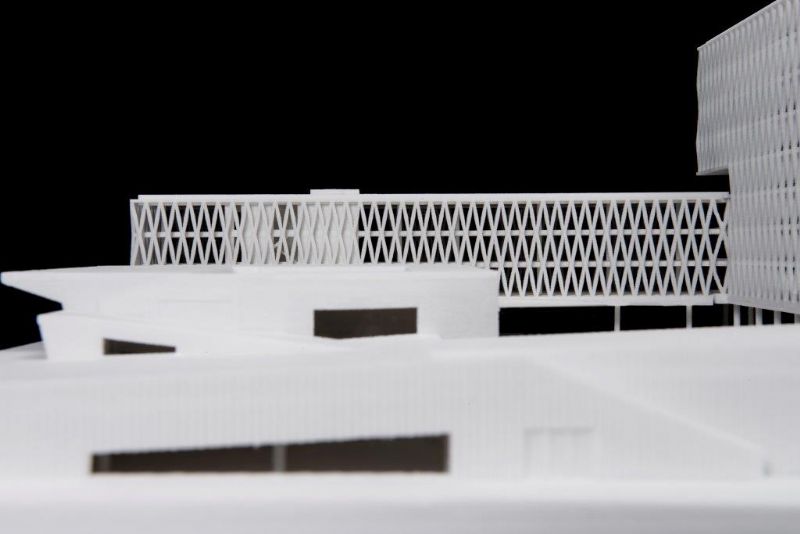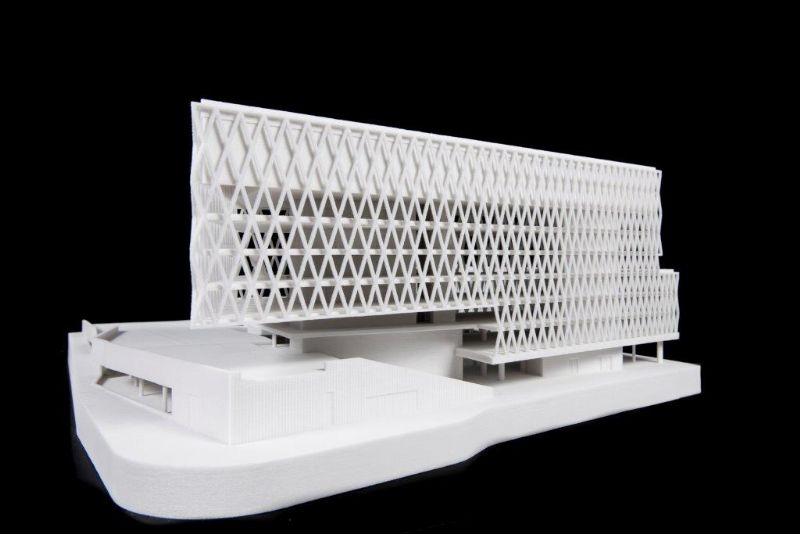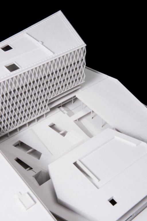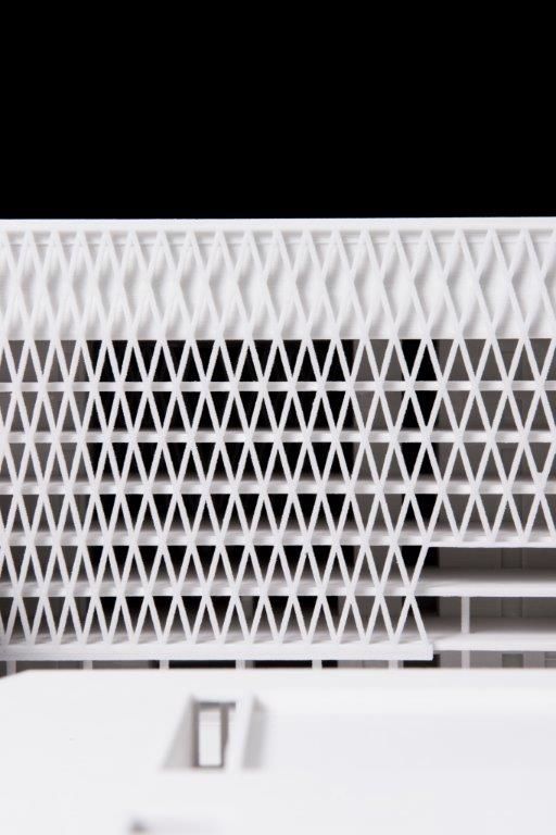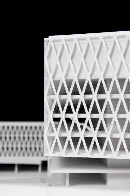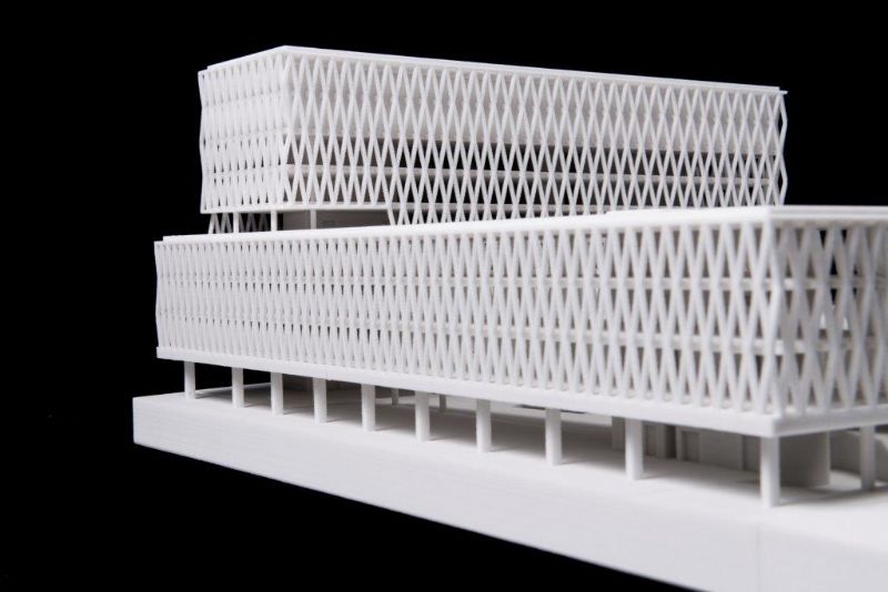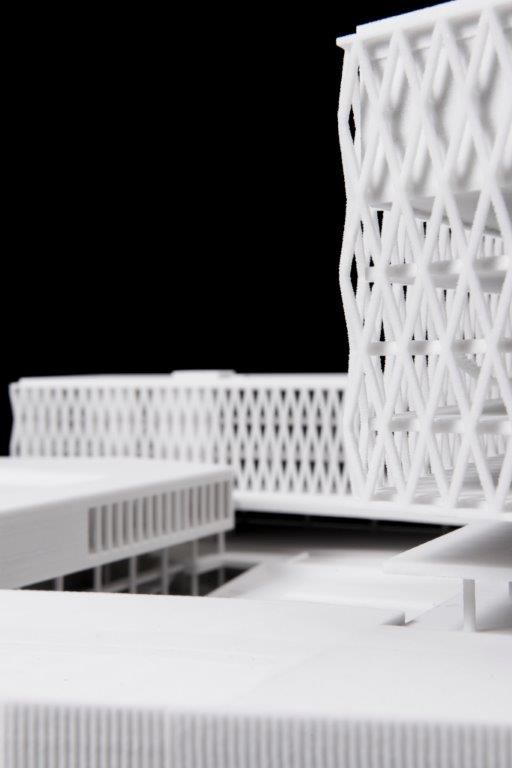 Tijdens de eerste testfases waren de volumes achter de rasterstructuur gesloten. Het transparante effect van de gevel ging daardoor helaas verloren. “Op aanvraag van de architecten hebben we de maquette uiteindelijk helemaal open gerealiseerd,” vertelt Geerten Vester. Dat vroeg een andere aanpak dan een gesloten maquette. “Stabiliteit was ons grootste bekommernis. In het streven naar transparantie hebben we getracht zoveel mogelijk binnenmuren te verwijderen. De gevelstructuur draagt letterlijk het hele gebouw waardoor we quasi als ingenieurs aan de slag moesten. Enkel de meest noodzakelijke binnenmuren zijn geprint, de rest hebben we weggelaten.”