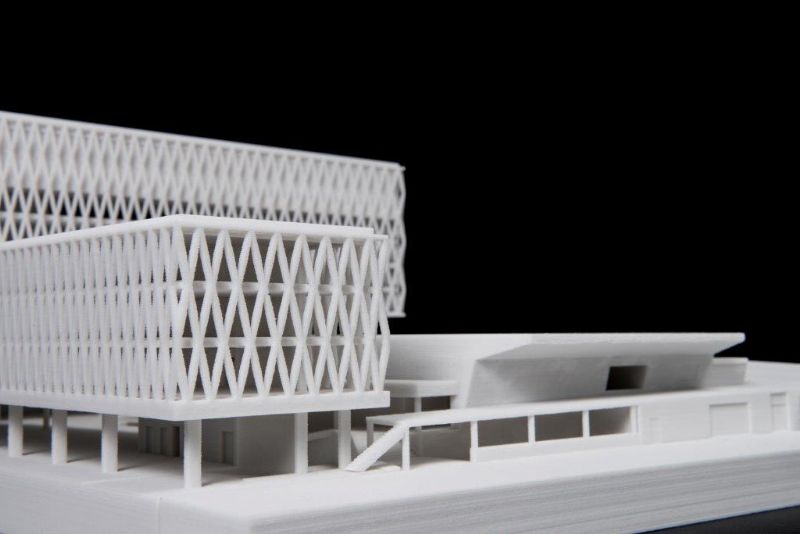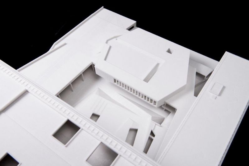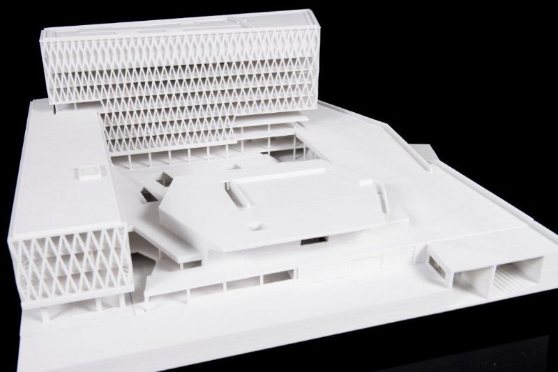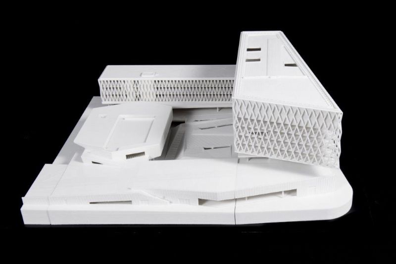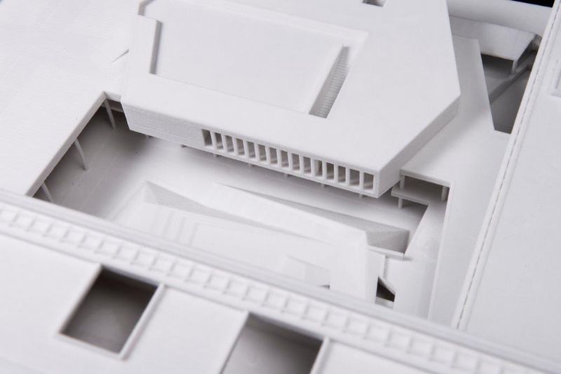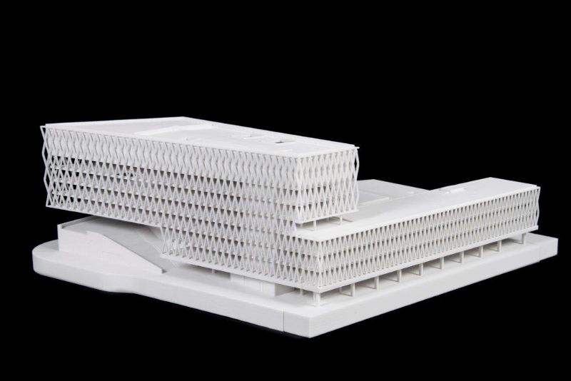 De maquette etaleert een opmerkelijke detailleringsgraad, getuige daarvan de fijne gevelstructuur met amplitude. Maar bij het aanschouwen van het model roemen de architecten ook de esthetiek van de 3D-print. “De textuur is ruw en dat is positief,’ vindt Patrick Lootens. “Door die tactiliteit wil je het model gewoonweg aanraken. En dat is de meerwaarde van dergelijk model: een maquette die zonder zorgen van hand tot hand kan gaan.” De ruwheid van het model brengt een mat effect met zich mee, tot grote tevredenheid van POLO Architects. “De ruwe oppervlaktes sluiten weerkaatsing van het licht en glans uit..”