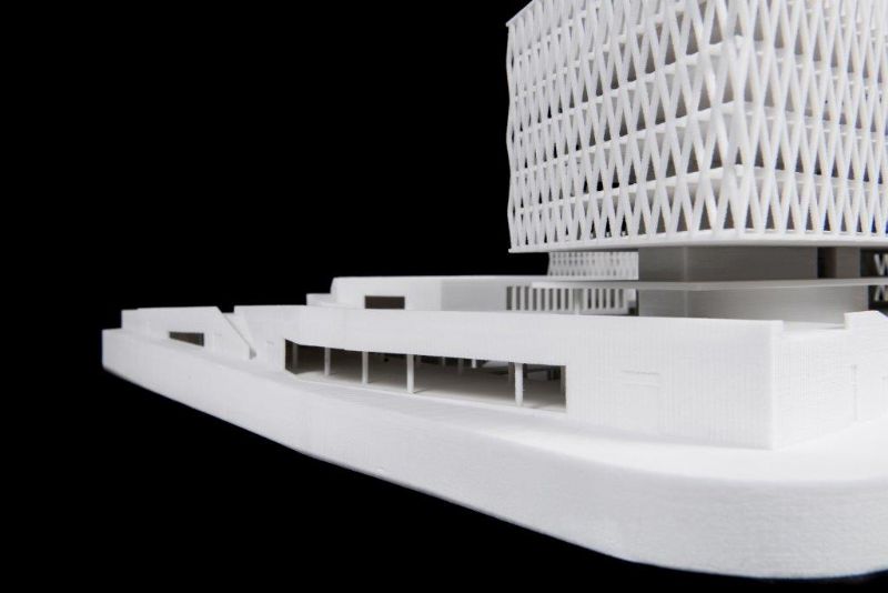 De maquette is het uiteindelijke resultaat van een dialoog tussen het architectenbureau en Goedhart Repro. Na een verkennend gesprek tussen beide partijen kreeg het verwachtingspatroon van POLO Architects vorm, waarin twee suggestie naar voor kwamen. De gevelstructuur mocht enerzijds als belangrijkste element van de architectuur prominent aanwezig zijn. Anderzijds hadden ze bij POLO Architects een bepaalde schaal voor ogen. “Dat was ons vertrekpunt maar al snel merkten we dat het gesuggereerde formaat niet noodzakelijk nodig was om de gevel goed weer te geven,” legt commercieel manager Geerten Vester van Goedhart Repro uit. “Daarop hebben we de gevelstructuur gefinetuned, zowel qua schaal als qua detailniveau, telkenmale in overleg met de architecten. Na een viertal testprintjes was de gevelstructuur en was het model klaar voor de 3D printer.”