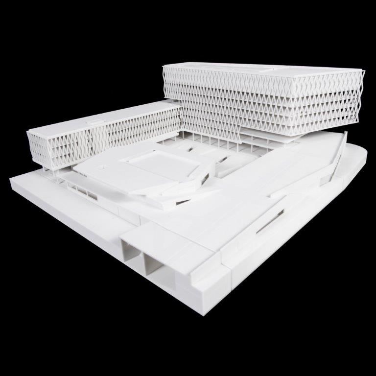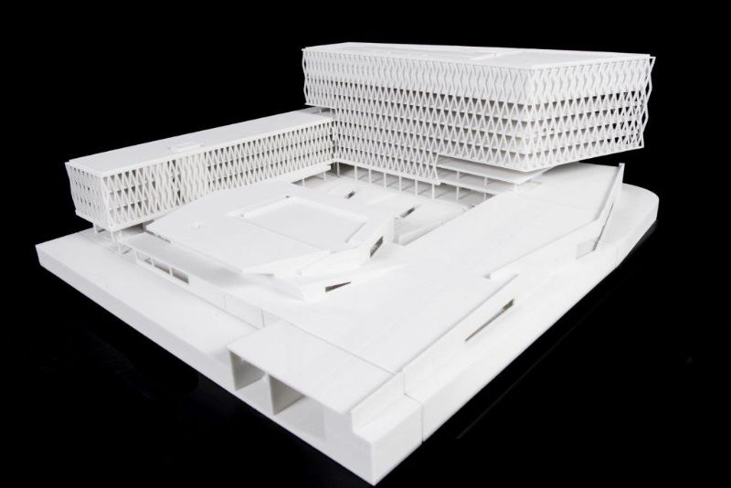 Terug in de tijd. We schrijven maart 2013. Printbedrijf Goedhart Repro houdt zich voor het merendeel bezig met reprografische oplossingen voor bedrijven. 3D-printen is een techniek in opmars en Goedhart Repro ziet er wel graten in, in ’t bijzonder voor maquettes in de architectuurwereld. Om zich deze vaardigheid eigen te maken zet het bedrijf samen met architectuurwebsite Architectura.be een wedstrijd op poten. POLO Architects komt met het project Artesis Plantijn Hogeschool in Antwerpen als één van de drie winnaars uit de bus. Een omvangrijk project dat, achteraf gebleken, om een 3D maquette smeekte. “Met 3D kan je meer in detail gaan dan met traditionele maquettebouw, waar je rekening moet houden met toleranties,” stelt Patrick Lootens. “In deze maquette is geen sprake van een foutmarge, kijk maar naar de amplitude in de betonnen rasterstructuur die feilloos uitgevoerd is.”