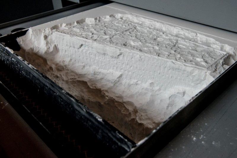 Goedhart Repro ging in eerste instantie aan de slag met een .stl-bestand. Daarover modelleerde het bedrijf een 3D printbaar model. “Door verschaling worden bepaalde elementen te klein om te printen. In ons ontwerp dikken we die elementen dan aan zodat de printer ze kan realiseren,” aldus Geerten Vester. De printer legt vervolgens lagen plaasterpoeder op elkaar. De printkoppen brengen een bindende stof op het poeder aan op de contouren van het model. Daarna blazen ze bij Goedhart Repro het poeder weg. “Eerst hebben we een beetje poeder verwijderd zodat de gevelstructuur bloot kwam te liggen. Die hebben we eerst gelijmd zodat de schil stevig werd. Daarna hebben we het poeder tussen de verdiepingen weggeblazen en de rest van de maquette gelijmd.”