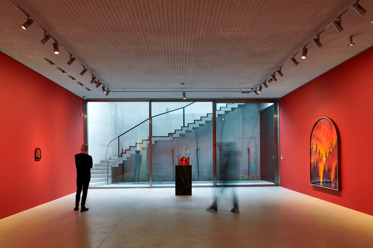 De opvallende aanbouw is gemaakt uit beton en glas en staat volledig los van het gebouw van de buurman. De ontkoppeling creëert een overgang tussen buiten en binnen en de straat en de tuin en zorgt bovendien voor een lichtflits die als het ware het startpunt is van een bezoek aan de galerij.