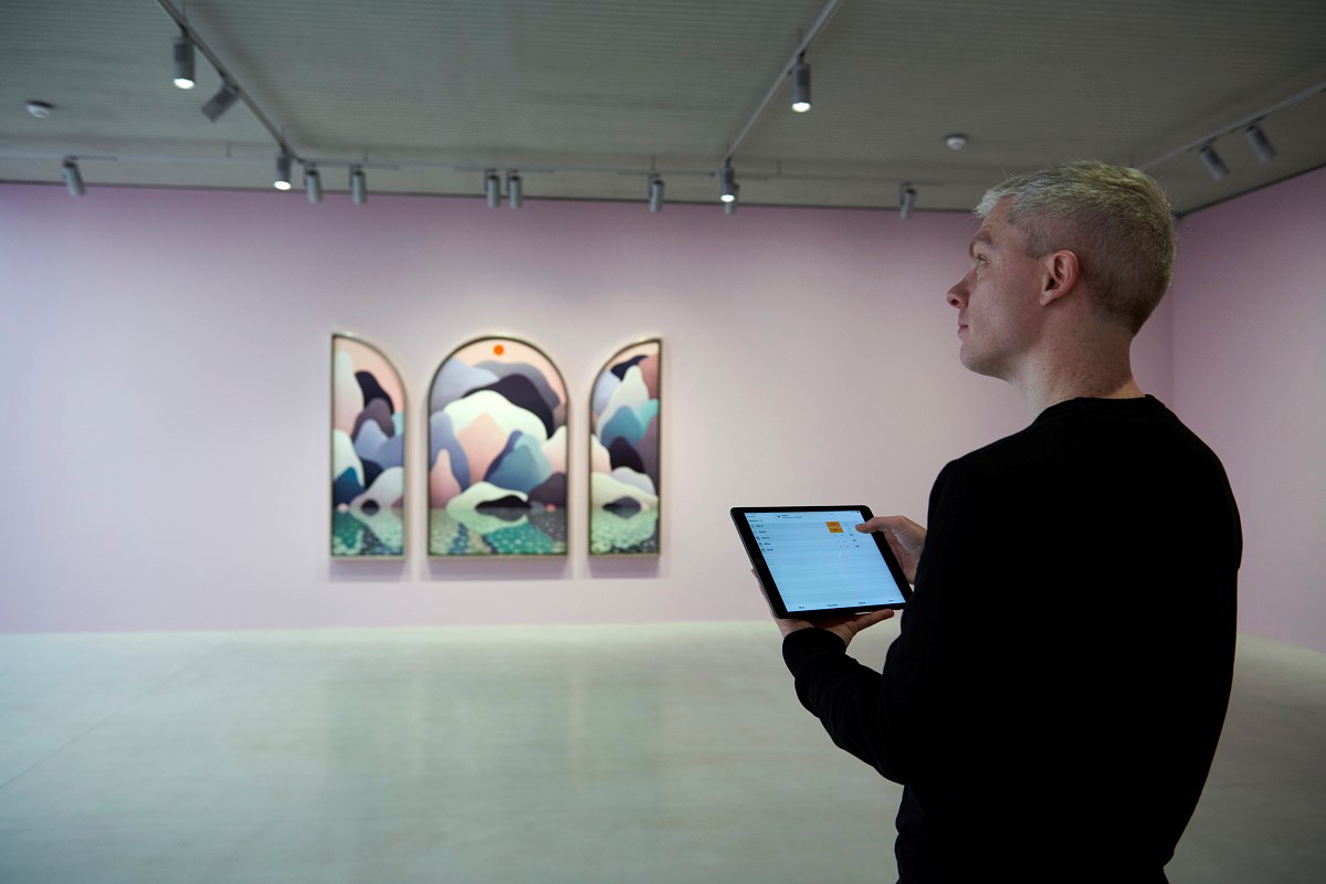 Wat dat perfecte licht en de juiste enscenering voor een kunstwerk net is, wordt per tentoonstelling door het team van Xavier Hufkens samen met de kunstenaar bepaald. Zo kunnen de spots vrij gepositioneerd worden op de spanningsrails en kan de lichtkleur ook afgestemd worden naargelang de wens van de kunstenaar. Dat kan per galerieruimte zelfs gewoon via een tablet. Soms kiest een kunstenaar er ook voor om de wanden een nieuwe kleur te geven die past bij de tentoongestelde kunstwerken met als resultaat een ruimte op maat van het kunstwerk.