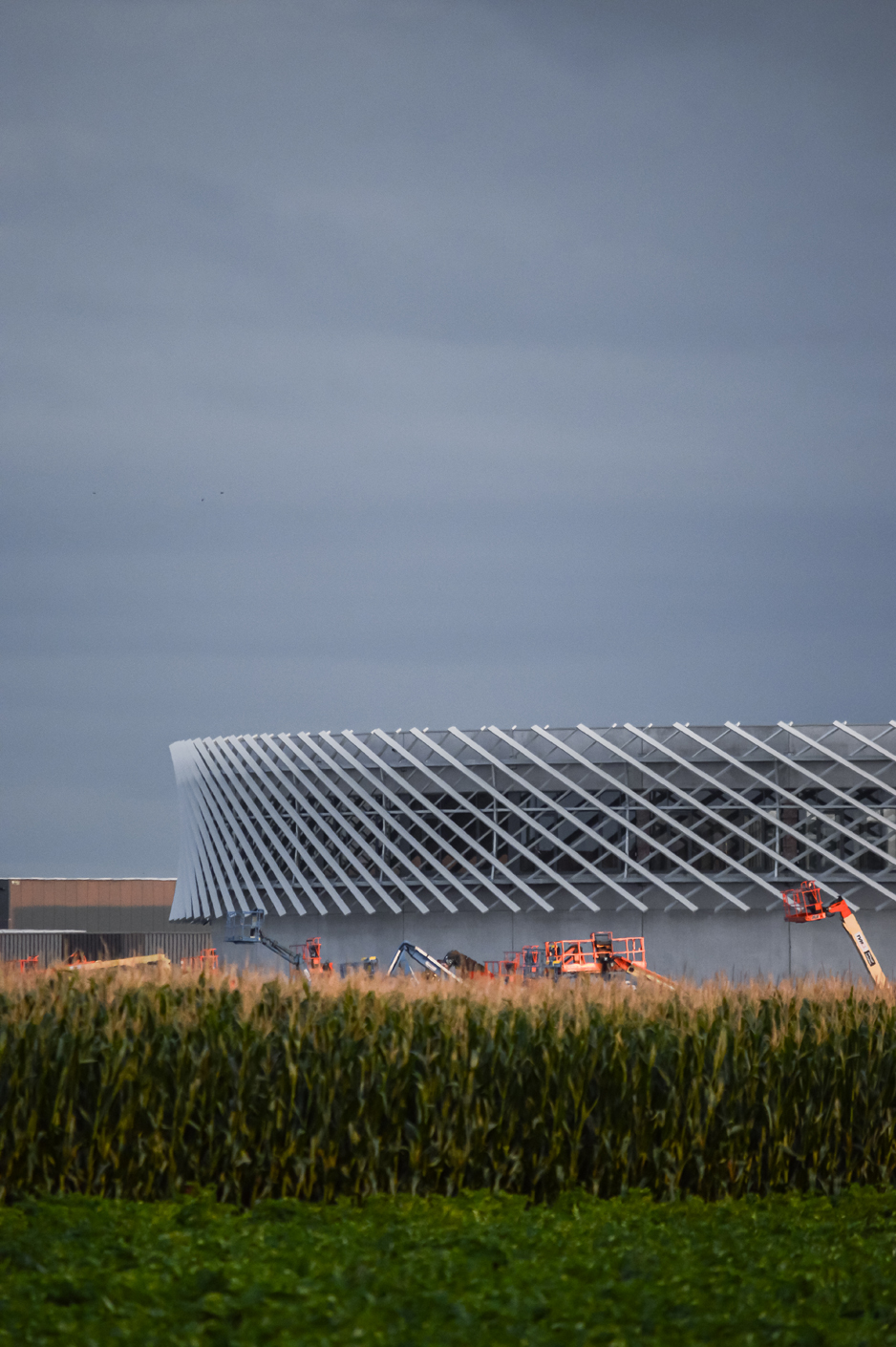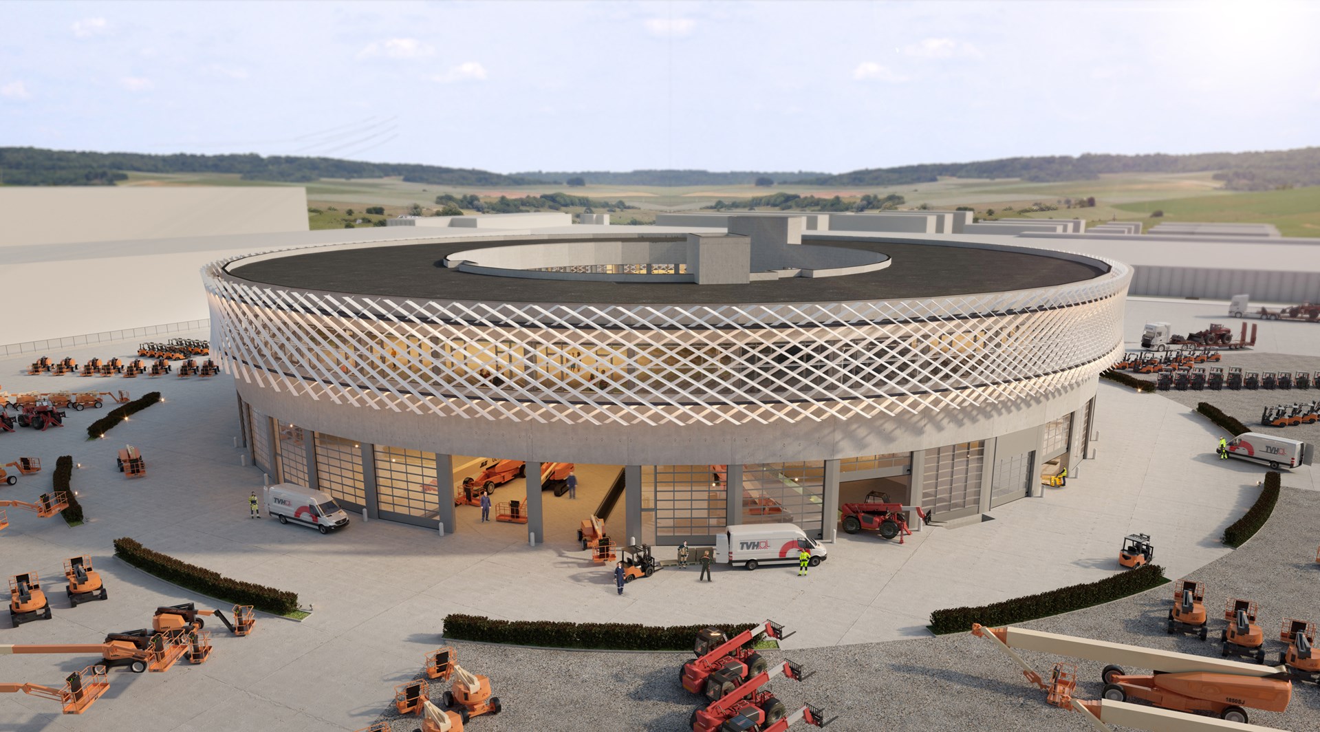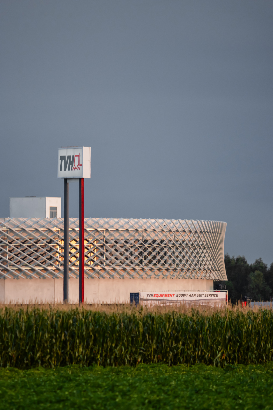 TVH Equipment, een specialist in de verkoop en het onderhoud van industriële machines zoals hoogwerkers en heftrucks, had specifieke eisen voor zijn nieuwe bedrijfsgebouw. "Om de 40 werkplaatsen efficiënt rondom het centrale magazijn te plaatsen, hebben we gekozen voor een ronde vorm," vertelt Deryckere. "Zonder dit ontwerp zouden de loopafstanden te groot zijn geworden. De kantoren voor meer dan 200 medewerkers zijn boven op het magazijn en de werkplaatsen geplaatst, en dankzij een onderkeldering ontstond er voldoende parkeerruimte. Alles viel op zijn plaats met dit ontwerp."