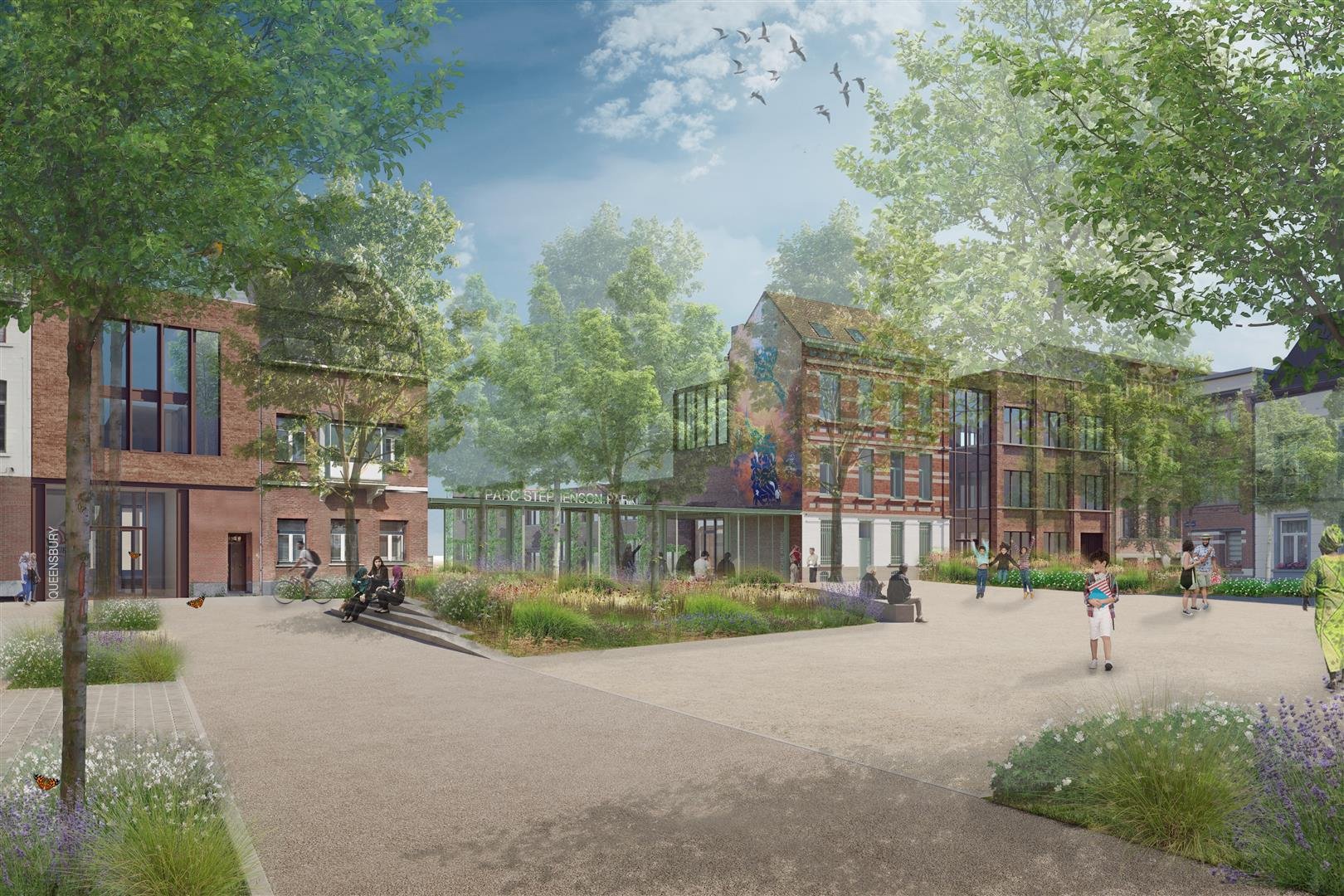 De buitenruimtes bestaande uit de voormalige moestuinen langs de spoorweg worden opnieuw zichtbaar verbonden met de openbare ruimte en zullen de herinrichting van het Stephensonplein omvatten. Deze transformatie wordt gecombineerd met de aanleg van sportvoorzieningen, een kinderdagverblijf, een overdekte openbare gemeenschappelijke ruimte, lokalen voor de parkwachters en lokalen voor sociale organisaties. De inplanting van deze functies en de inrichting van het park zijn coherent ontworpen om gevels te activeren en sociale controle te bevorderen.