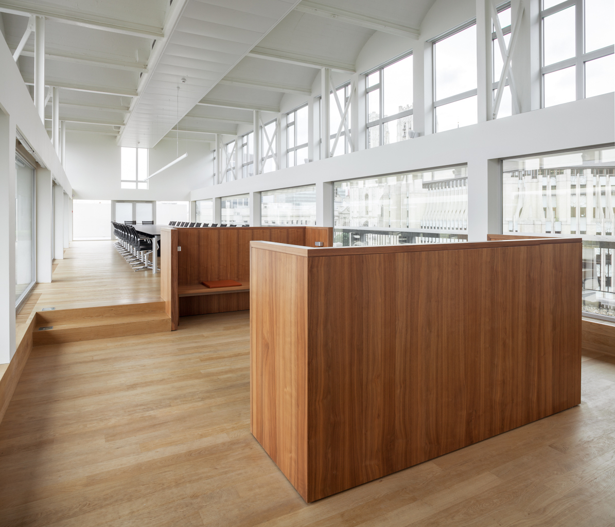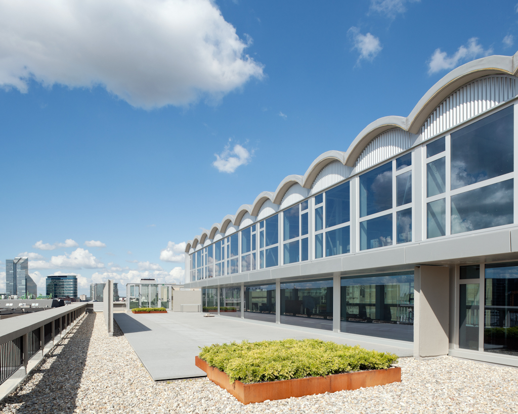 Bijzonder is ook de herbestemming van de dakpaviljoens. Ooit ingericht als slaapruimtes voor nachtploegen van de RTT, zijn ze nu omgevormd tot vier vergaderzalen en twee lounges. Het dakterras zelf werd volledig aangelegd als buitenruimte en fungeert als extensie van de werkplek: een unieke plek voor overleg of ontspanning met zicht op de Brusselse skyline.