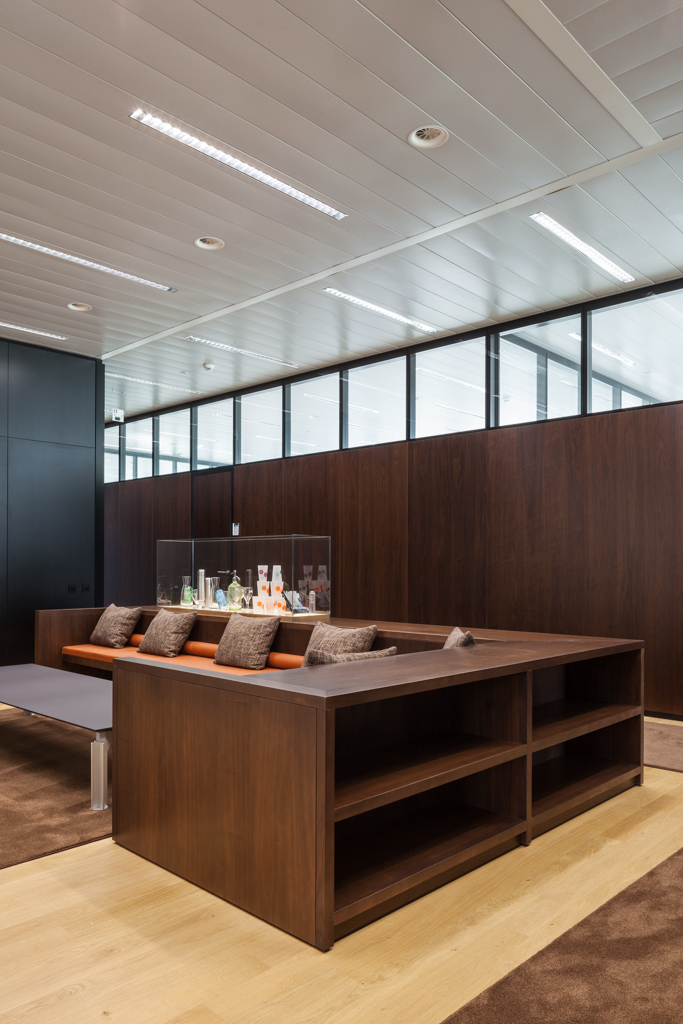 In tegenstelling tot de hedendaagse trend van open kantoorlandschappen, vroeg Vivaqua om een klassieke, meer gesloten opzet met individuele kantoren. Die ‘old school’ inrichting werd gecompenseerd door het gebruik van hoogwaardige materialen en een verfijnd kleurenpalet, waardoor de sfeer tegelijk zakelijk en stijlvol blijft.
