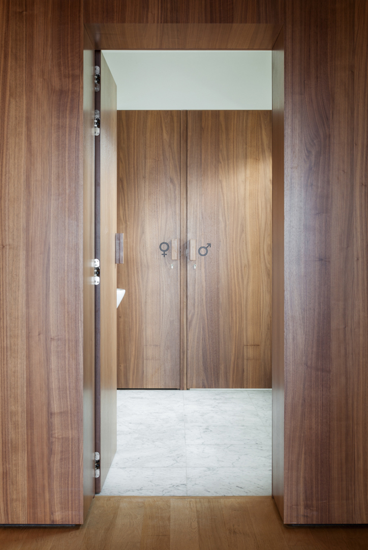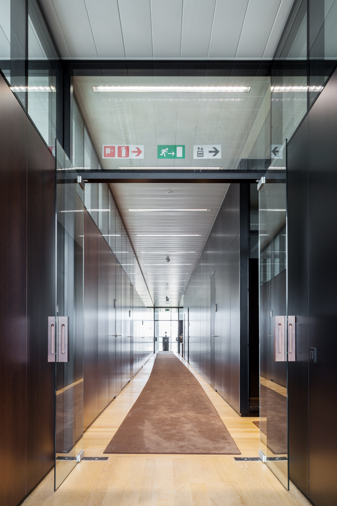Materialen zoals Carrara-marmer en notelaar vormen de rode draad doorheen het gebouw en versterken de identiteit van de nieuwe hoofdzetel. Ook binnen de kantoorruimtes is gekozen voor een sobere en coherente afwerking: witte scheidingswanden aan de kantoorzijde maximaliseren het daglicht, terwijl zwarte wanden aan de gangzijde zorgen voor een warme en luxueuze sfeer.