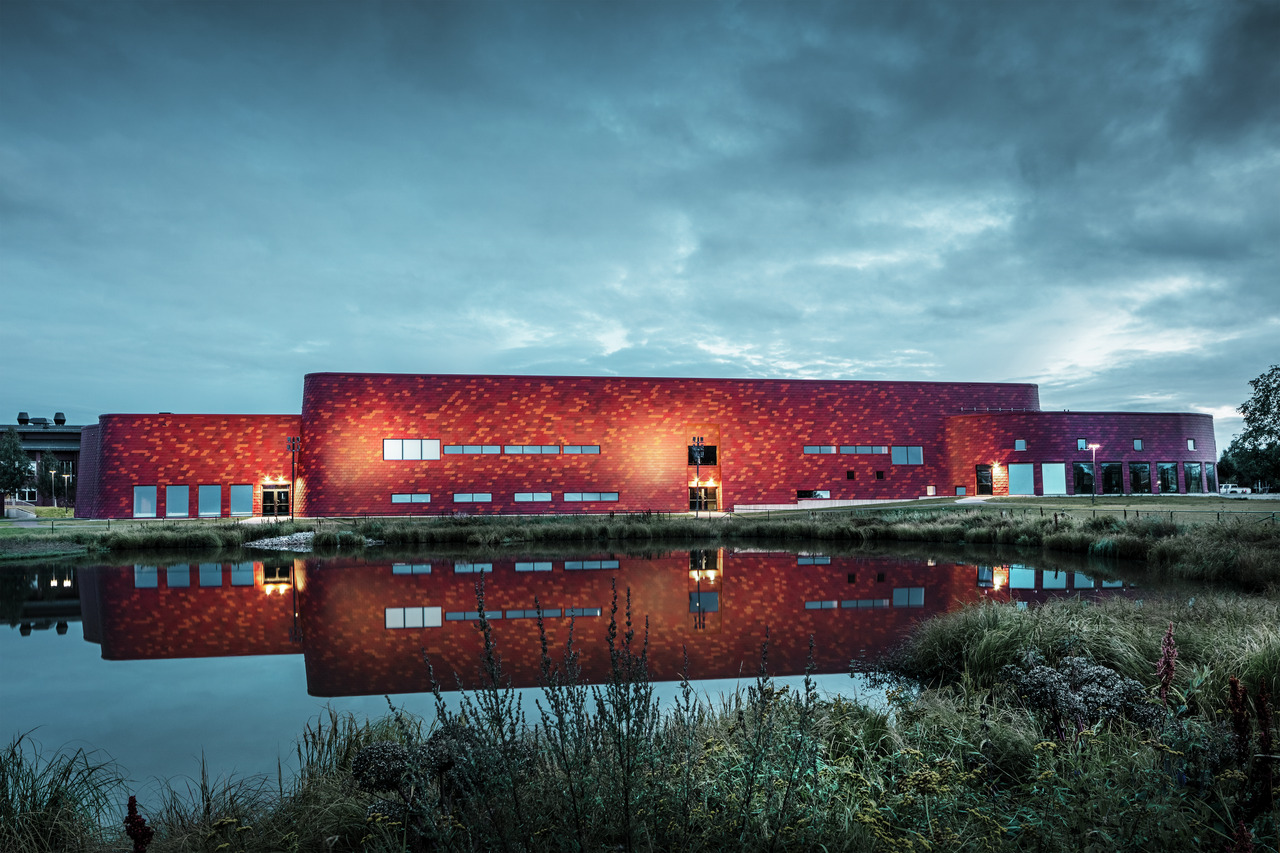 Bij de planning van de 6.500 m² grote hal zocht de architect naar een ”vorm van bescheidenheid, die de hal waardigheid en helderheid verleent”. Door afgeronde hoeken, verschillende bouwhoogtes en een licht naar achteren hellende gevel in vijf verschillende tinten rood is het gelukt om de reusachtige binnenruimte voor de toeschouwer passend te verpakken.
