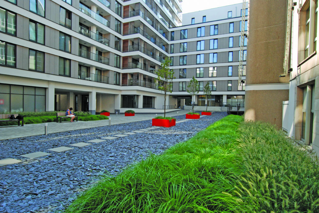 Het gerenoveerde appartementsgebouw Livingstone 1 in Brussel is een realisatie van architectenbureau ARCHI2000 en Cordeel. De bouwheer verkoos een ondergrondse parkeergarage voor bewoners en werknemers. De ideale kans voor de aanleg van een prachtige daktuin op een parkeerdak door IBIC. Zo kunnen omwonenden en omliggende kantoren genieten van een privaat stukje groen midden in de stad.