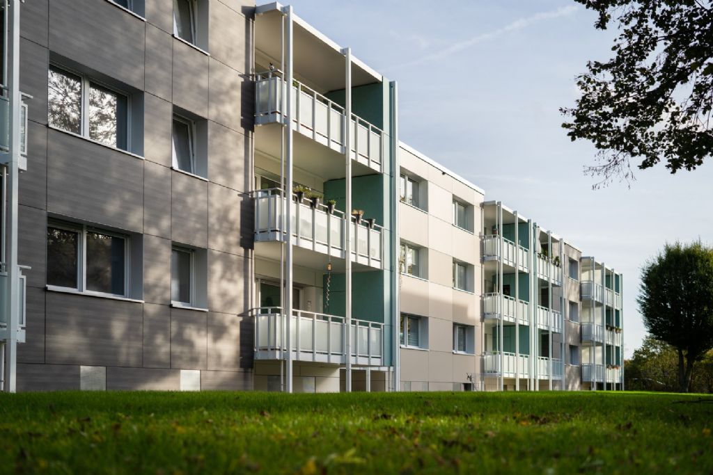 De 68 woningen in de drie appartementsgebouwen aan de Thomas-Morus-Weg in de wijk Rumphorst die recentelijk door de woningbouwvereniging Munster zijn gerenoveerd, zijn een uitstekend voorbeeld van wat kan worden bereikt. Het doel hier was om kosteneffectiviteit te koppelen aan aantrekkelijke vormgeving en duurzaamheid. Zoals gebruikelijk in grote delen van Noord-Rijnland-Westfalen hebben deze gebouwen uit de late jaren zestig bakstenen gevels.