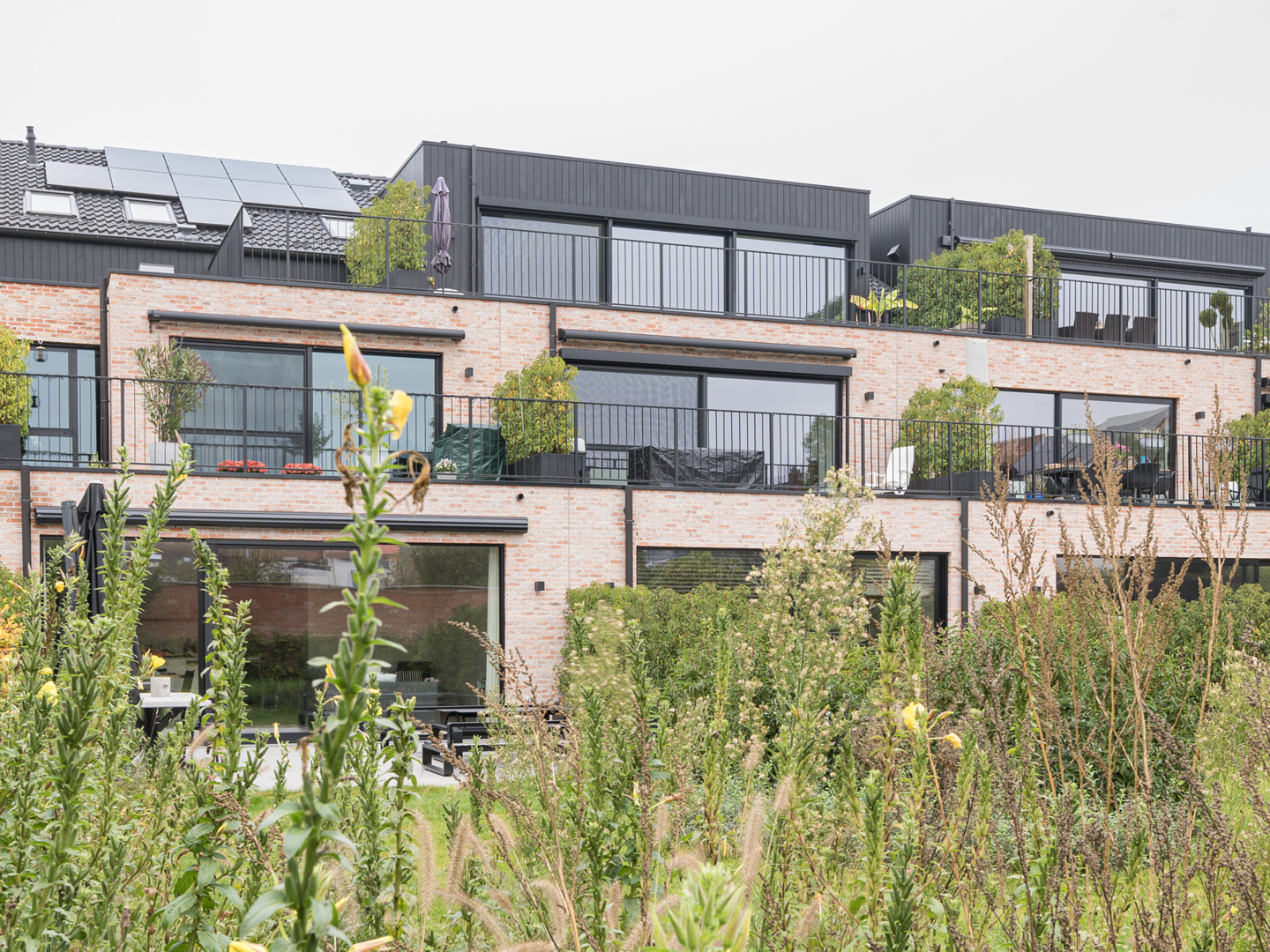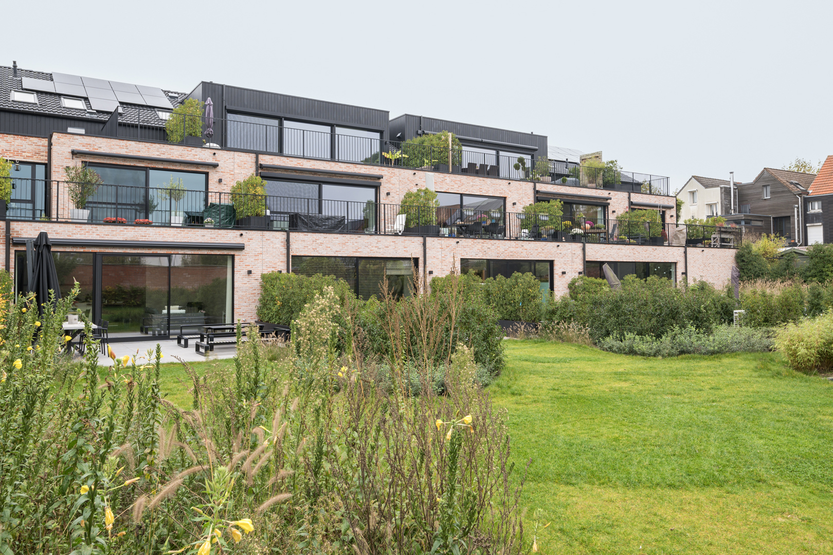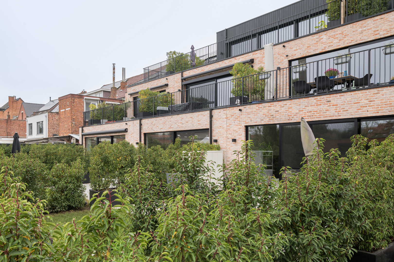 De achtertuin vormt het collectieve hart van het project en is ingericht met een wadi die water opvangt en vertraagd afvoert. De gelijkvloerse appartementen delen deze tuin rechtstreeks, terwijl de bovenliggende woningen uitkijken op het groen. Die opbouw versterkt de relatie tussen privé en collectief, zonder de privacy van de bewoners uit het oog te verliezen. De tuin fungeert tegelijk als ecologische buffer en als kwaliteitsvolle buitenruimte in een dense woonomgeving.