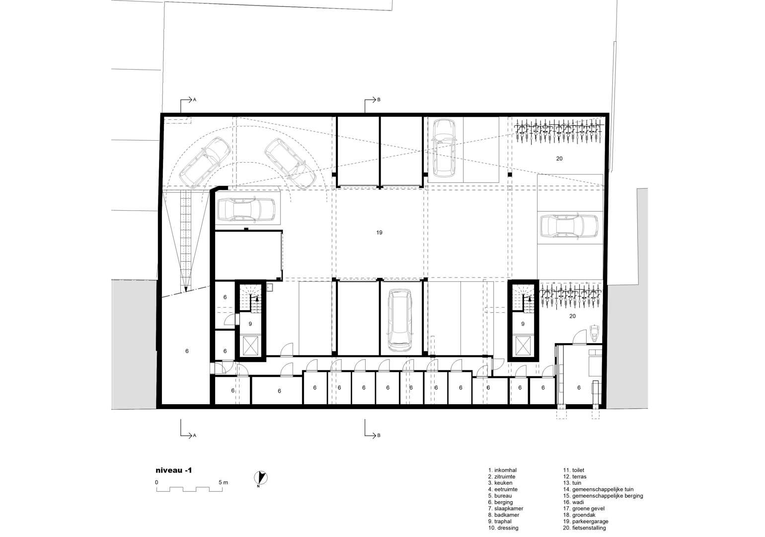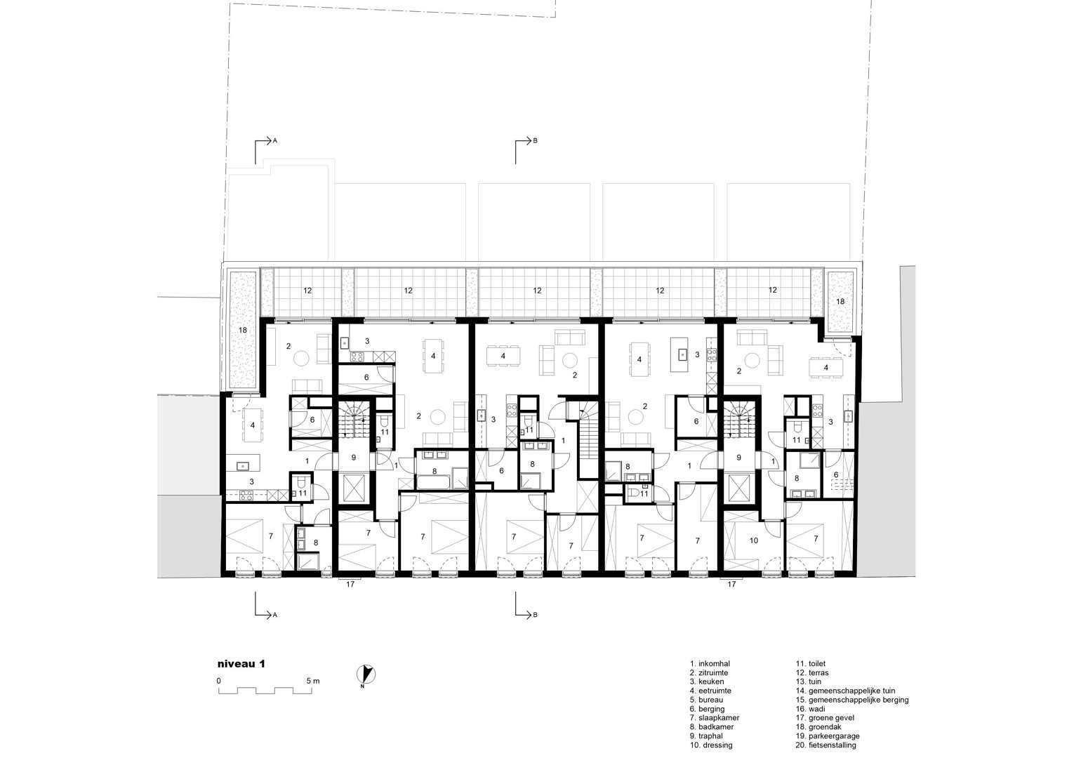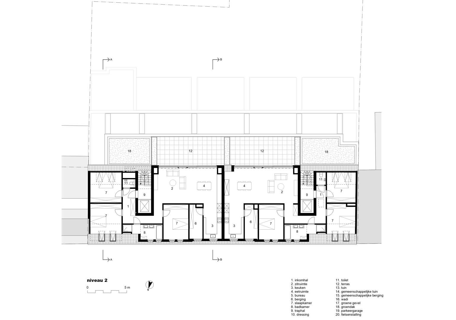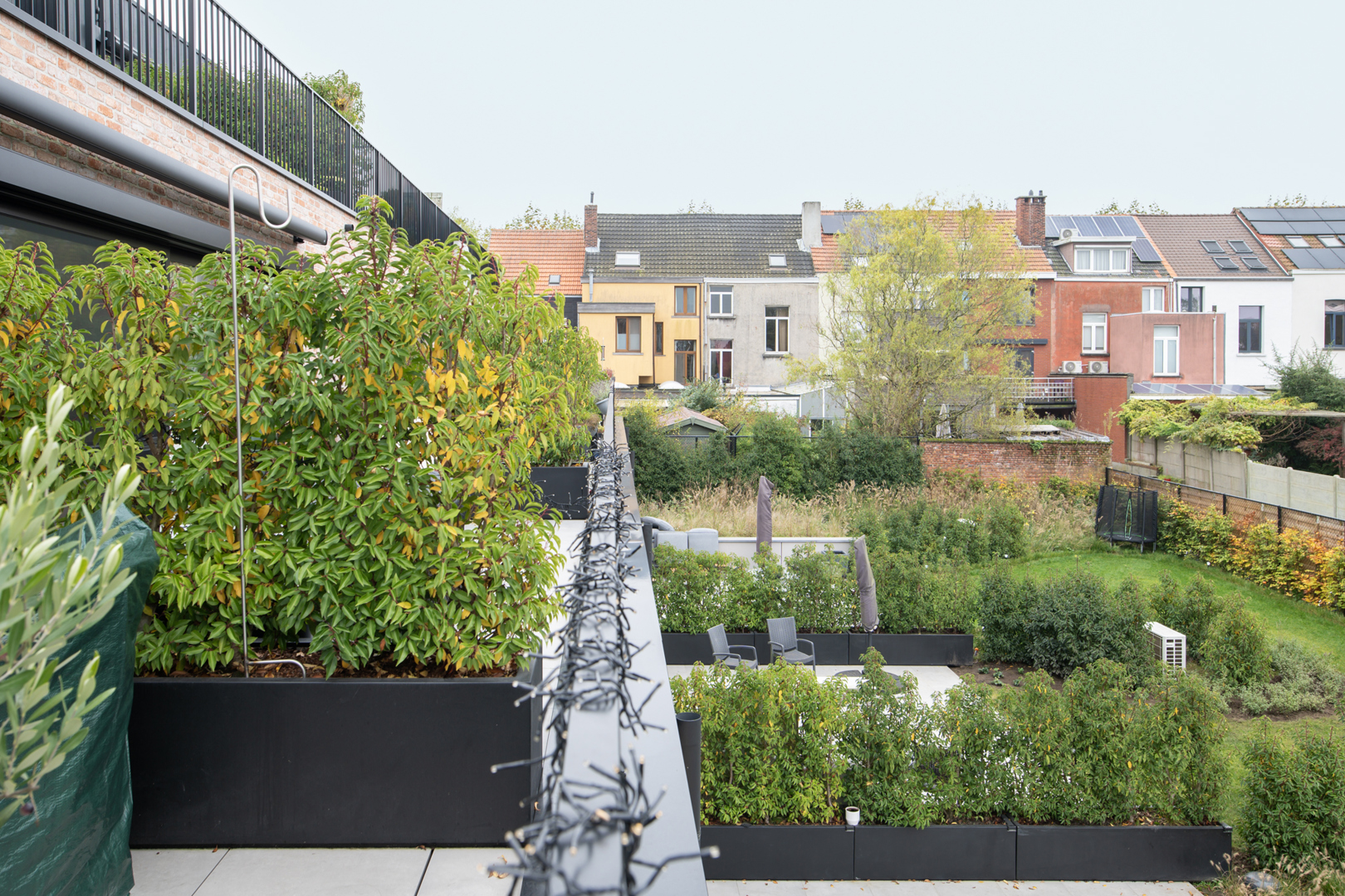 De achtertuin vormt het collectieve hart van het project en is ingericht met een wadi die water opvangt en vertraagd afvoert. De gelijkvloerse appartementen delen deze tuin rechtstreeks, terwijl de bovenliggende woningen uitkijken op het groen. Die opbouw versterkt de relatie tussen privé en collectief, zonder de privacy van de bewoners uit het oog te verliezen. De tuin fungeert tegelijk als ecologische buffer en als kwaliteitsvolle buitenruimte in een dense woonomgeving.