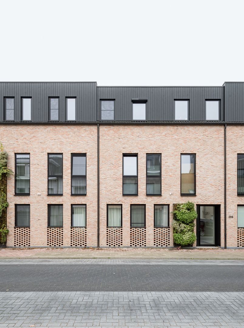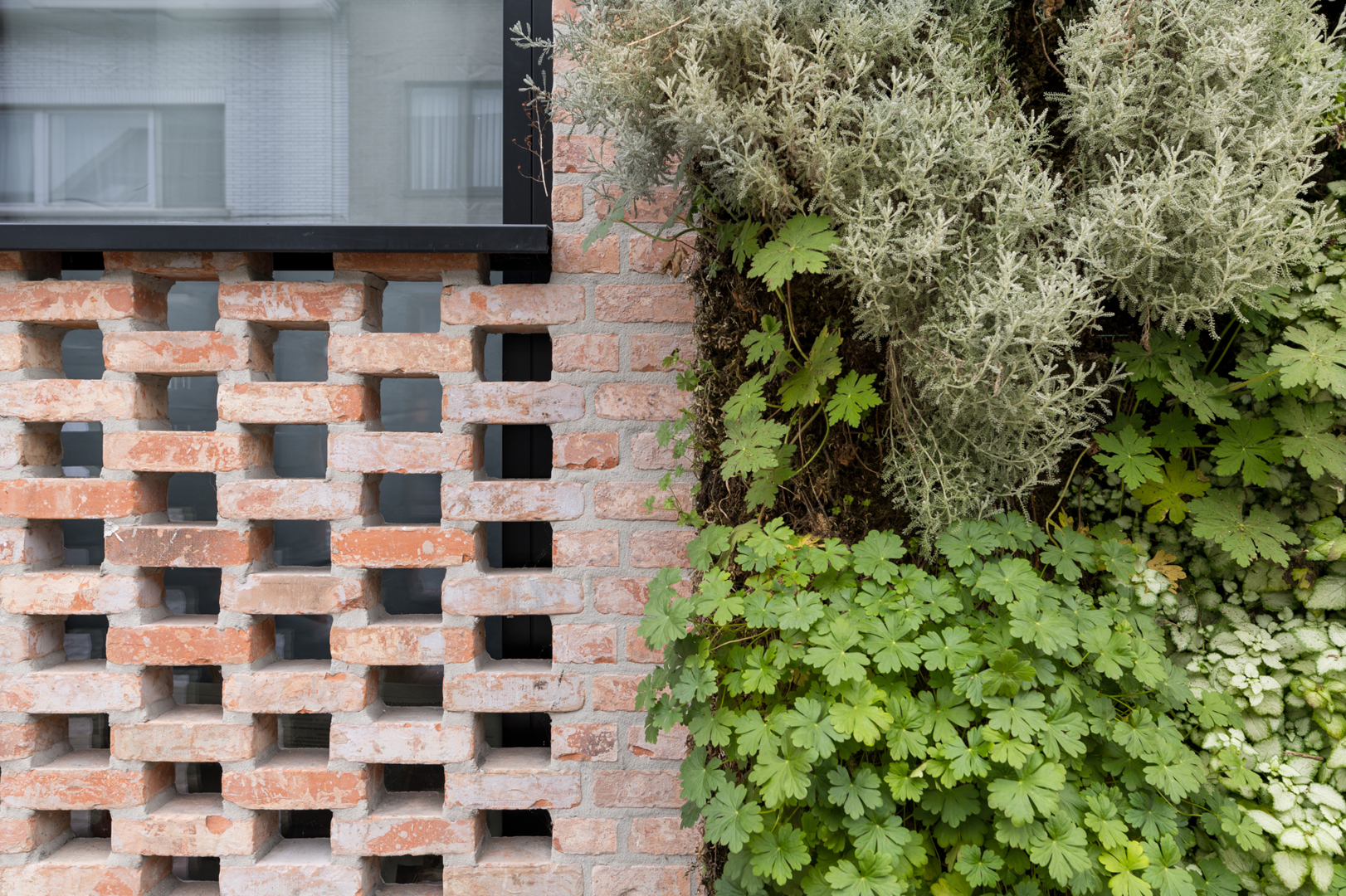 Groen vormt een expliciete rode draad doorheen het project. Aan de straatzijde zorgen muurtuinen voor een zachte vergroening van een verder volledig verharde context, met minimale irrigatie als uitgangspunt. Ook de zijgevel kreeg een groene bekleding, waardoor het volume zich losmaakt van zijn perceelsgrenzen. Aan de achterzijde fungeren geïntegreerde plantenbakken als natuurlijke scheidingen tussen de balkons, die bewoners zelf kunnen invullen en laten meegroeien met hun woongebruik.