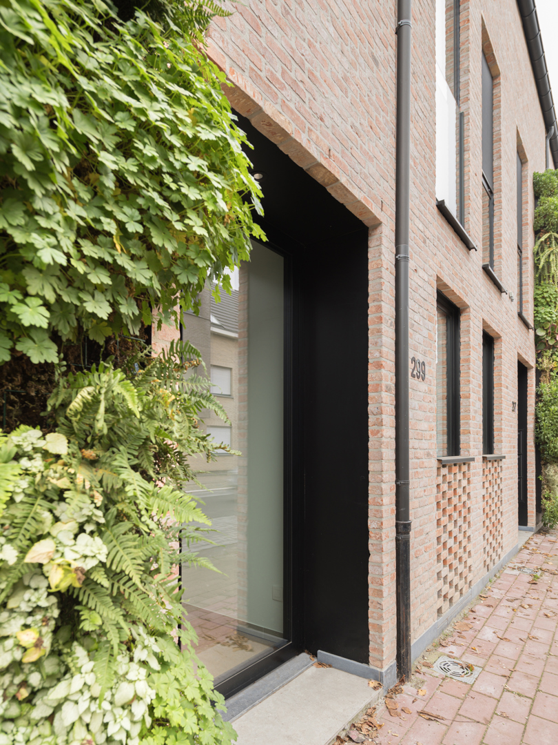 De voorgevel is consequent opgebouwd met één raamtypologie, wat zorgt voor rust en samenhang. Op het gelijkvloers introduceert een claustra-metselverband meer privacy zonder licht weg te nemen, terwijl de kleinere ramen op de bovenste verdieping verwijzen naar de lokale bouwstijl van het begin van de twintigste eeuw. De dakkapellen zijn afgewerkt in zwart gebrand hout, gekozen omwille van duurzaamheid en beperkt onderhoud. Zo ontstaat een gevel die tegelijk hedendaags is en geworteld in haar omgeving.