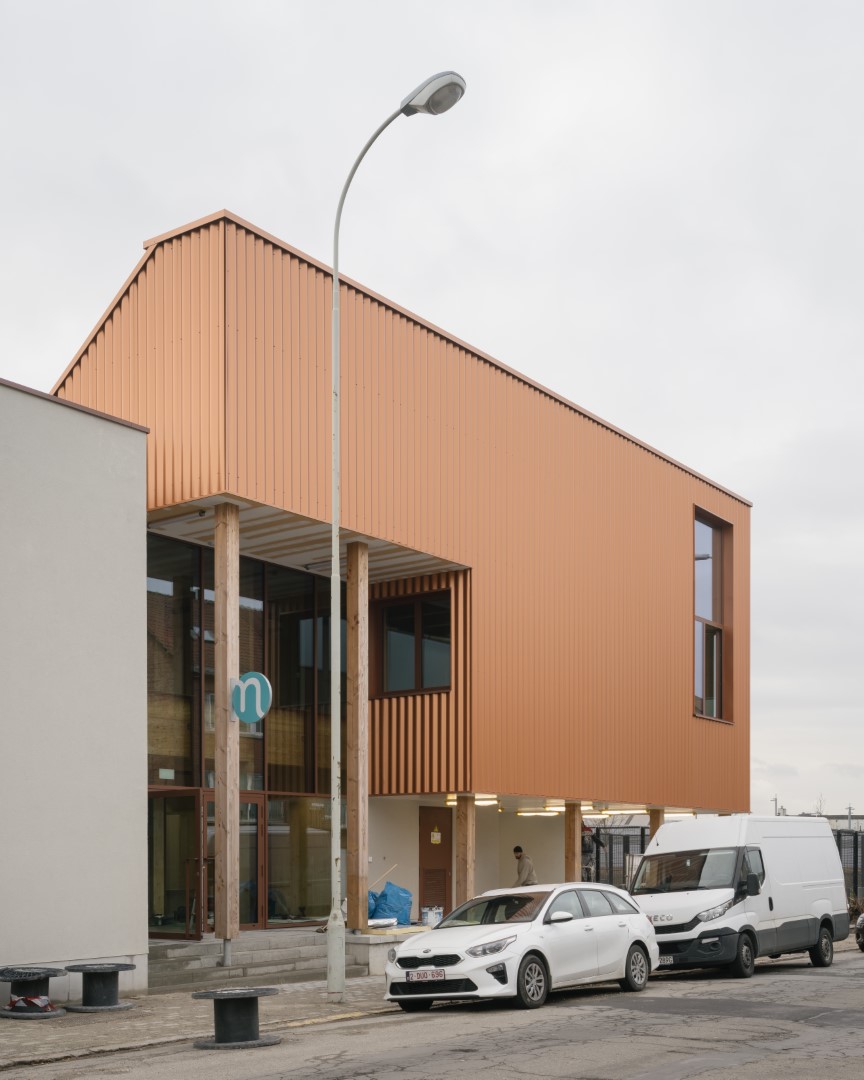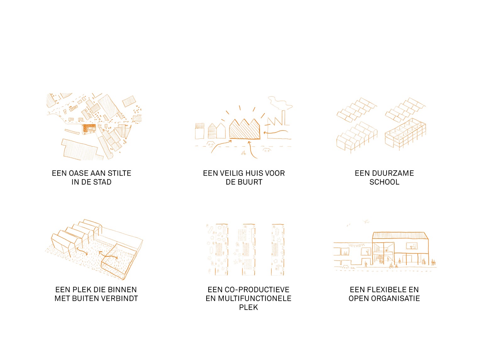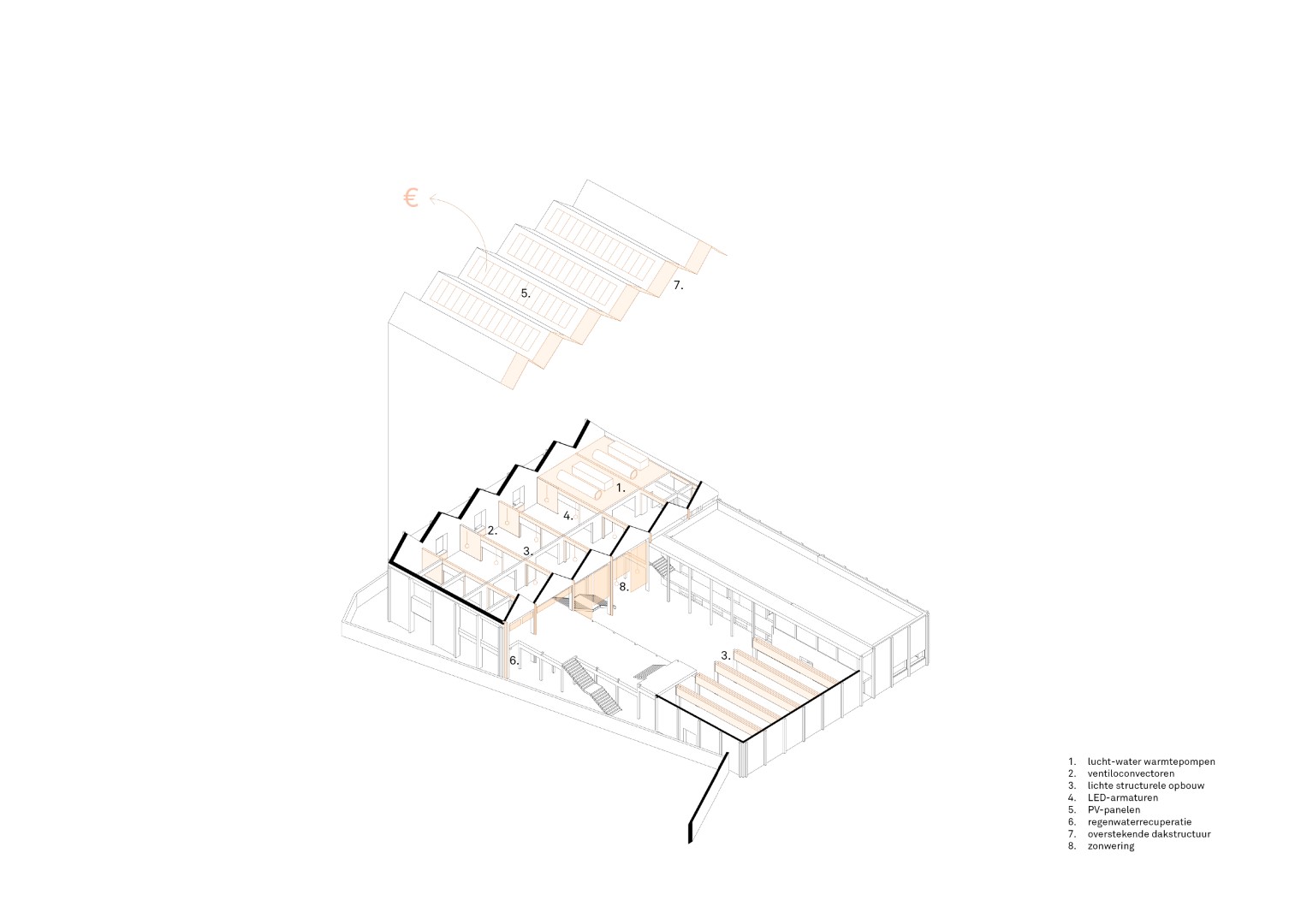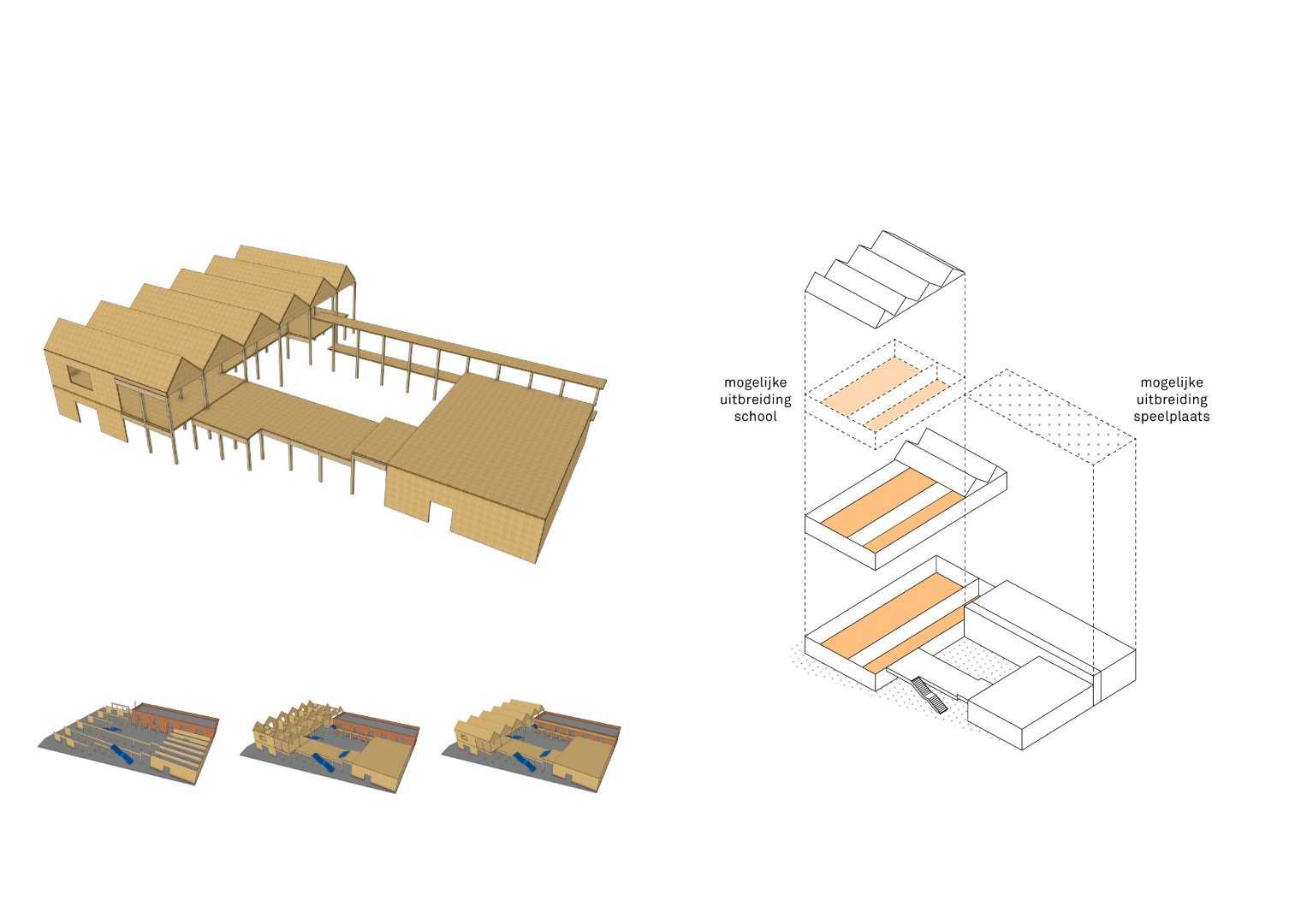 Aan de straatzijde werd de draagconstructie van het bestaande gebouw hersteld om het zo logistiek toegankelijker te maken. Naast het huidige gebouw werd een houten constructie van zes schuine daken toegevoegd. Onder deze daken bevinden zich de lokalen, terwijl de zone ervoor als verbinding fungeert. Deze royale transitzone vormt de voordeur van de school en is bewust ruim bemeten, zodat de tussenruimte gebruikt kan worden als buitenklas. Het open grondplan versterkt de relatie tussen de klaslokalen onderling maar ook met de buitenruimte.