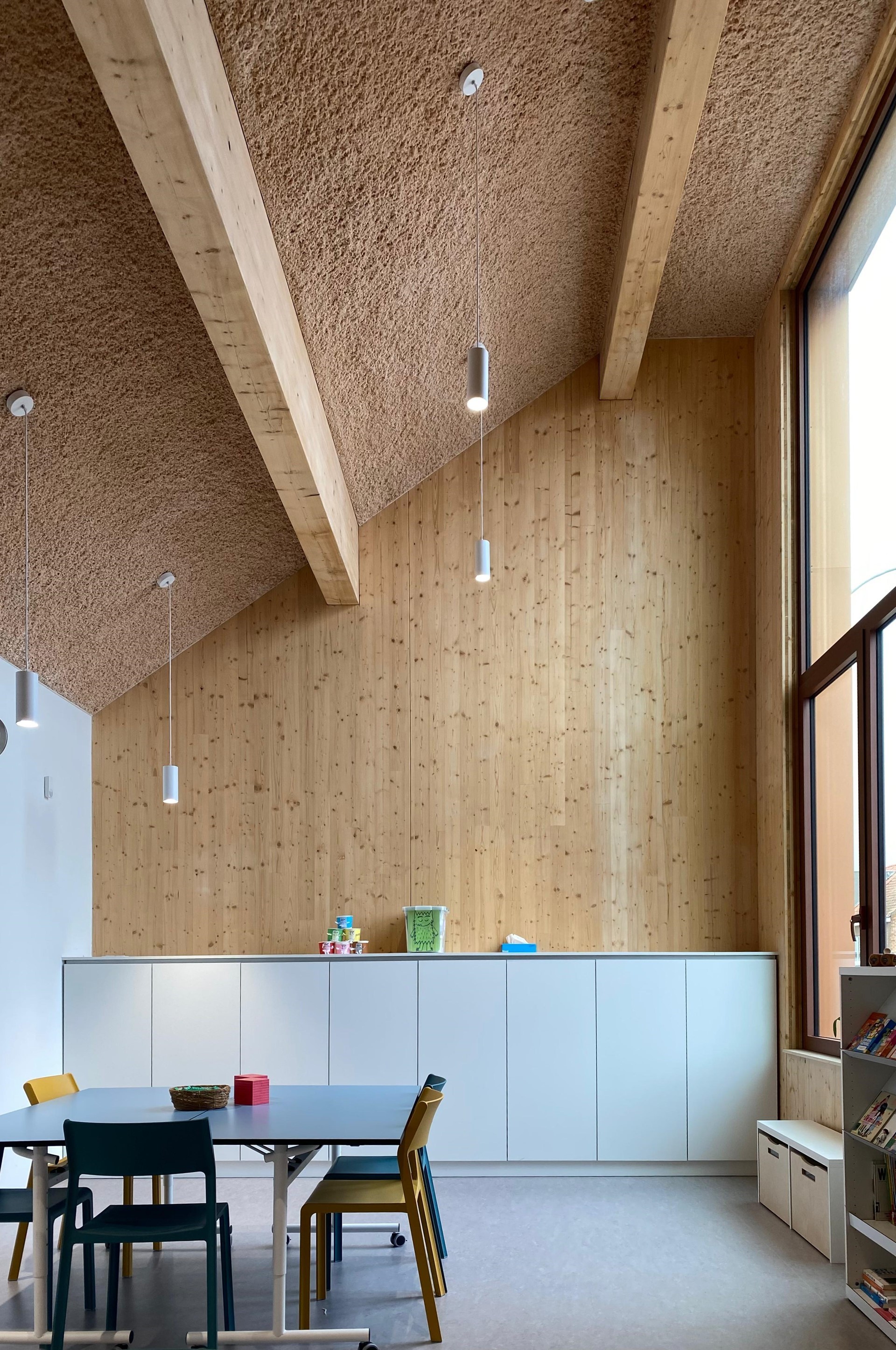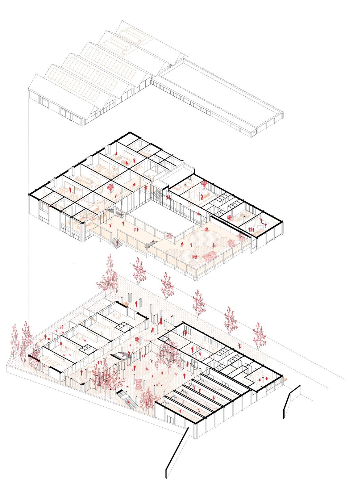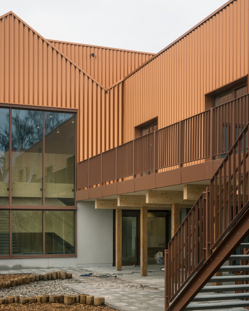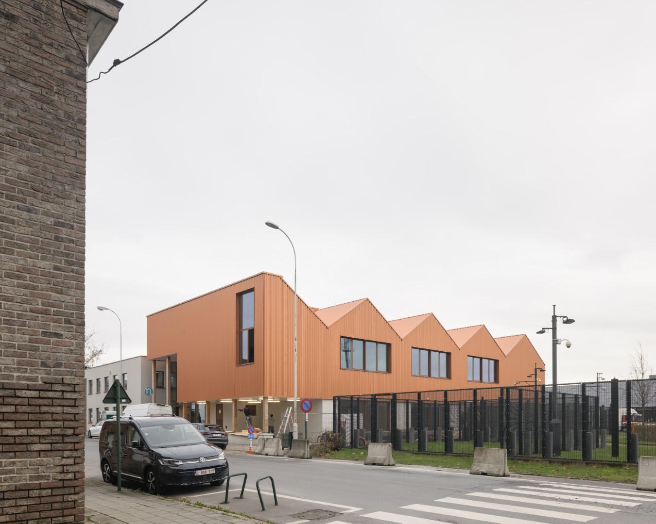 Aan de straatzijde werd de draagconstructie van het bestaande gebouw hersteld om het zo logistiek toegankelijker te maken. Naast het huidige gebouw werd een houten constructie van zes schuine daken toegevoegd. Onder deze daken bevinden zich de lokalen, terwijl de zone ervoor als verbinding fungeert. Deze royale transitzone vormt de voordeur van de school en is bewust ruim bemeten, zodat de tussenruimte gebruikt kan worden als buitenklas. Het open grondplan versterkt de relatie tussen de klaslokalen onderling maar ook met de buitenruimte.