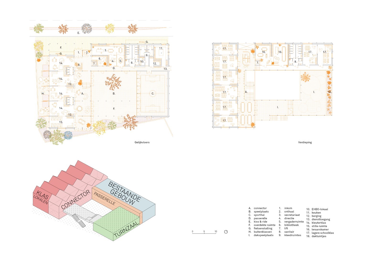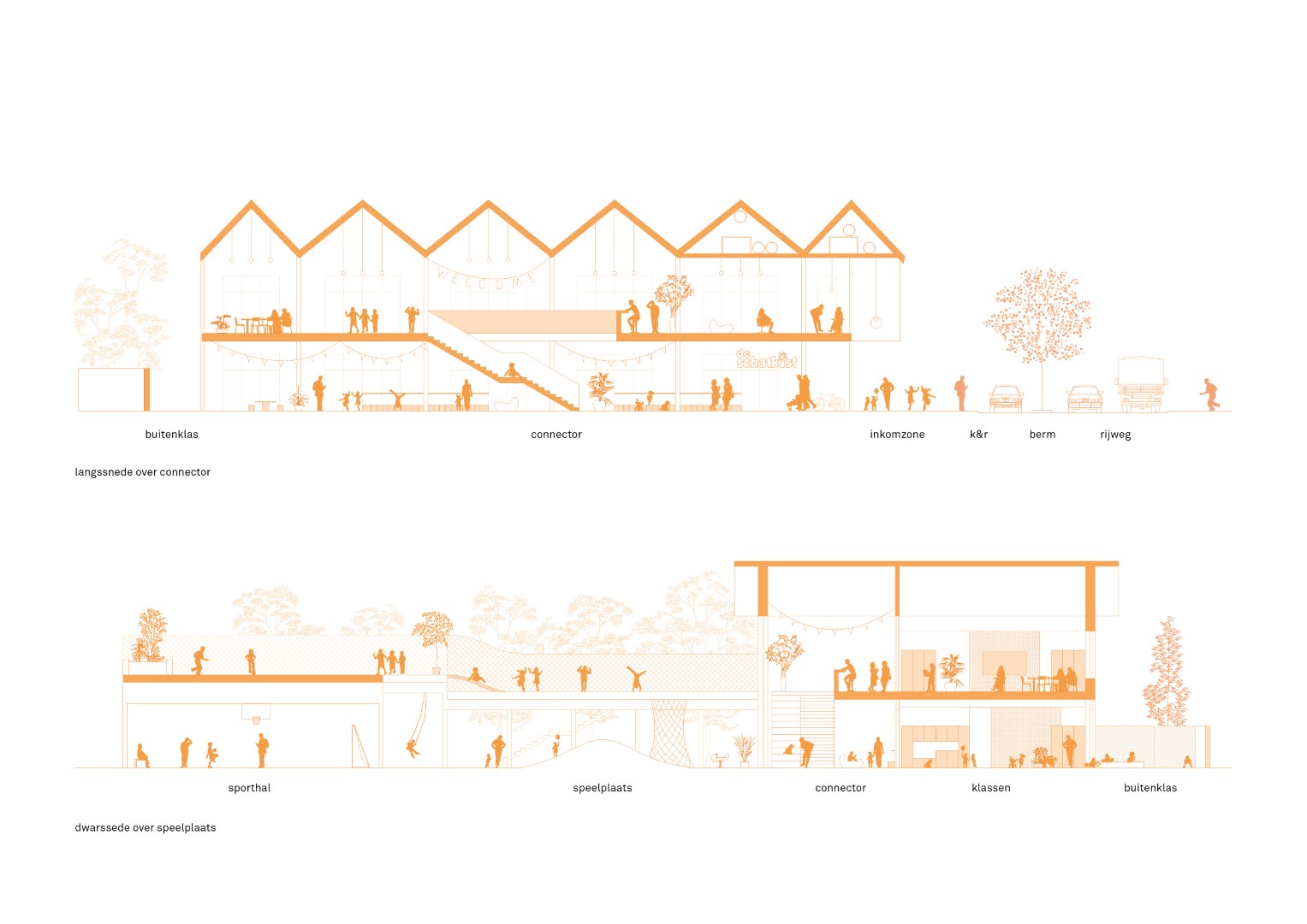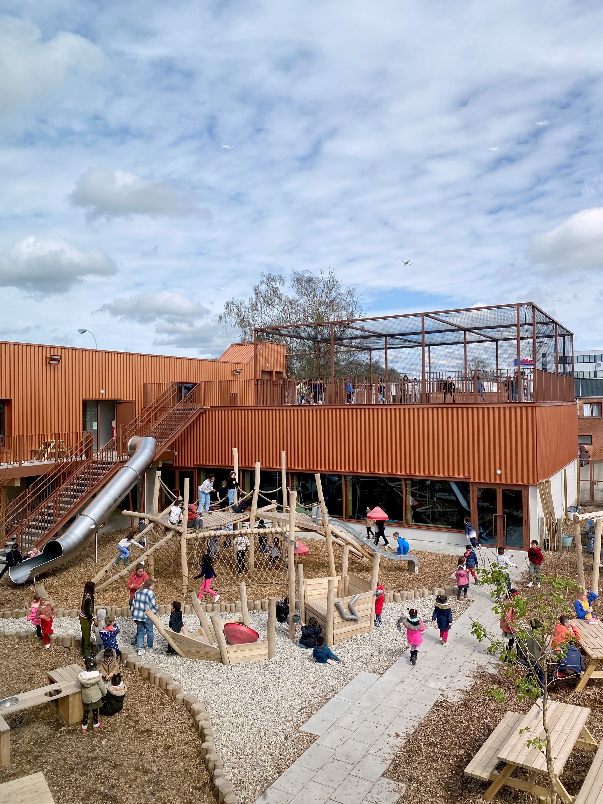 Gezien de beperkte omvang van het terrein is ervoor gekozen om het overdekte deel van de speeltuin zo in te richten dat de platte daken ook als speelplekken toegankelijk zijn. Het overdekte deel biedt op zijn beurt weer ruimte voor een gymzaal, die direct tegenover de verbindingsruimte is gelegen. Door de open gevel van beide delen kan deze ruimte gebruikt worden als verlengstuk van de speeltuin.