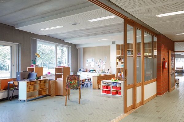 Er zijn 6 klaslokalen per verdieping, die per drie worden geclusterd rond een polyvalente ruimte. Elke klas heeft schuifdeuren die het mogelijk maken om van de cluster en zelfs van de verdieping één grote ruimte te maken.