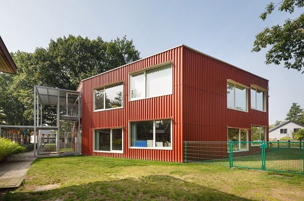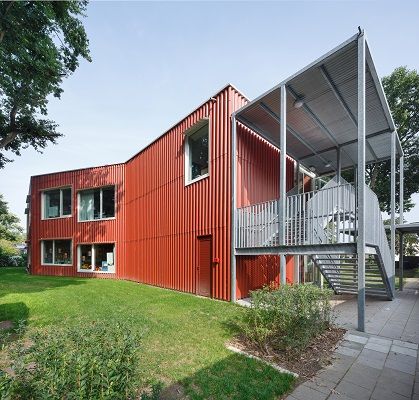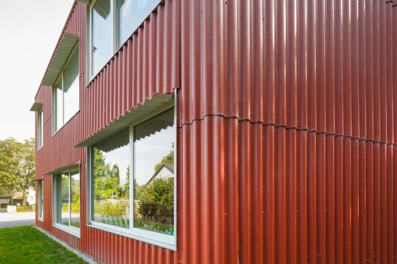 De gevels werden bekleed met de koraalrode (projectkleur) golfplaten van Eternit. Dit levert een licht en vrolijk beeld. De verticale lijnen van de platen stroken met de plooilijnen waarlangs de gevel zich om het gebouw wikkelt.