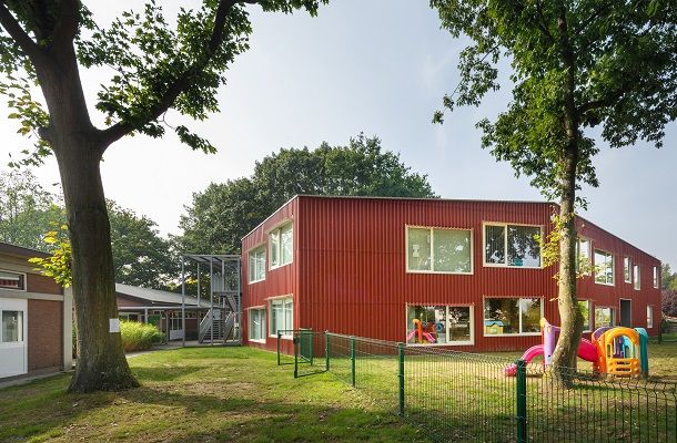 In Rumst staat een opvallende en zeer kleurrijke school met een gevel in koraalrode vezelcement golfplaten. In deze uitbreiding van een bestaand schooltje werd veel aandacht besteed aan een leuke gevel, de groene omgeving, de aansluiting met de omliggende straat, de ruimtelijkheid en de circulatie van de binnenruimte zodat er een maximale zorg is voor de leerlingen.