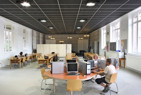 Chris Wyns , schooldirecteur: “In 2009 werd een nieuwe vleugel van het scholencomplex in gebruik genomen. Hierdoor kwamen een aantal lokalen vrij, waaronder de vroegere refter”. Hij nam de landschapsarchitecte Ann Voets onder de arm die een nieuw masterplan voor de hele schoolsite bedacht. Het masterplan gaf aan dat de oude refter, de link tussen de speelplaats en een binnentuin, perfect kon ingericht worden als leraarskamer. “Het gegeven is uniek, een prachtige lange en hoge ruimte, langs beide zijden beglaasd, met overzicht op de speelplaats en toch gelinkt aan een rustige binnentuin,” aldus architect Roland Piffet. “We hebben de ruimte drie functies gegeven maar met behoud van het ruimtegevoel, dat was één van onze prioriteiten.”