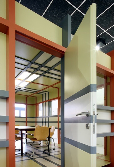 Het meest in het oog springend is de ‘babbelbox’, een akoestisch afgesloten vergaderruimte die de ingangen van de directielokalen maskeert. De ‘babbelbox’ is een grafisch spel van stijlen en regels, ingevuld met gekleurde vlakken of glas. “Het patroon, geïnspireerd op de kledingindustrie, is vertaald in 3D waardoor er een interessante gelaagdheid ontstaat. Dat grafisch aspect is trouwens doorgetrokken naar de binnenruimte wat voor een bijzondere leuke vergaderatmosfeer zorgt.”