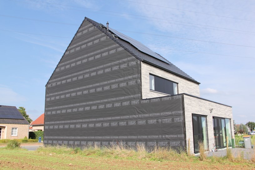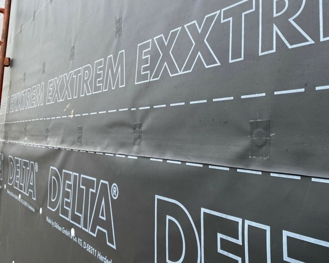 In afwachting van de definitieve bekleding of afdekking wordt DELTA®-EXXTREM als voorlopige bescherming tegen de wachtgevel geplaatst. De wachtgevel is hierdoor afgeschermd van zon, wind, regen of stuifsneeuw.