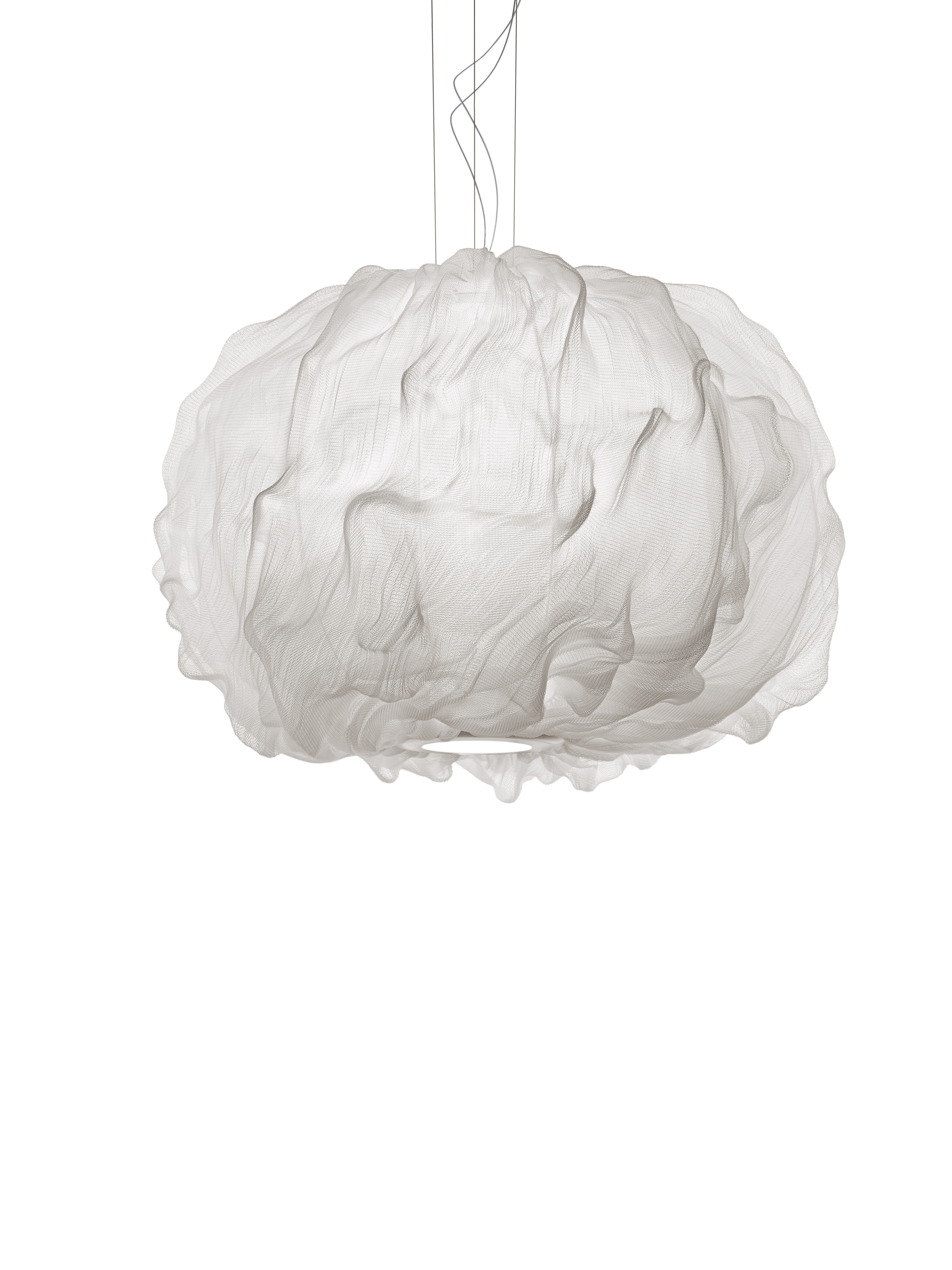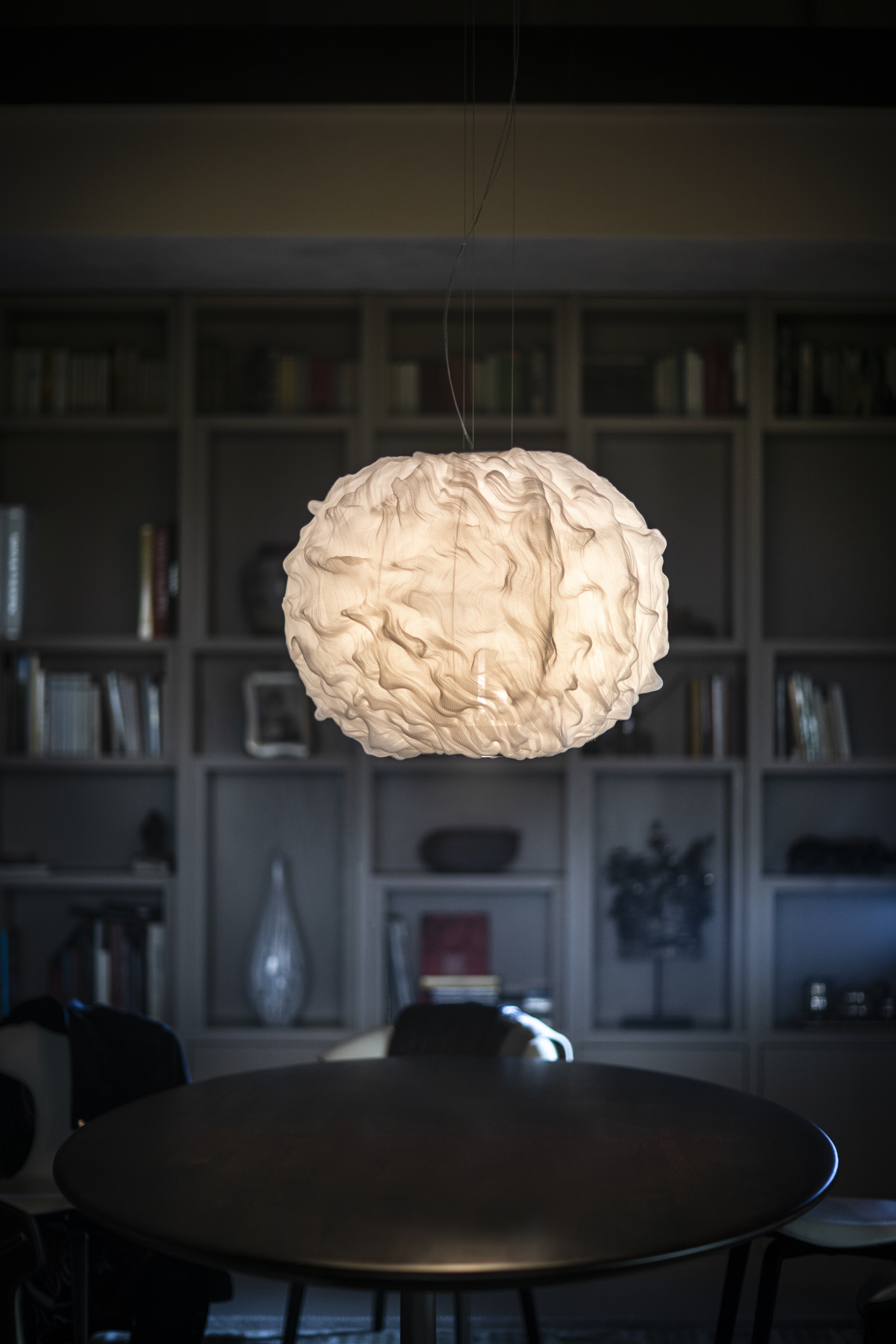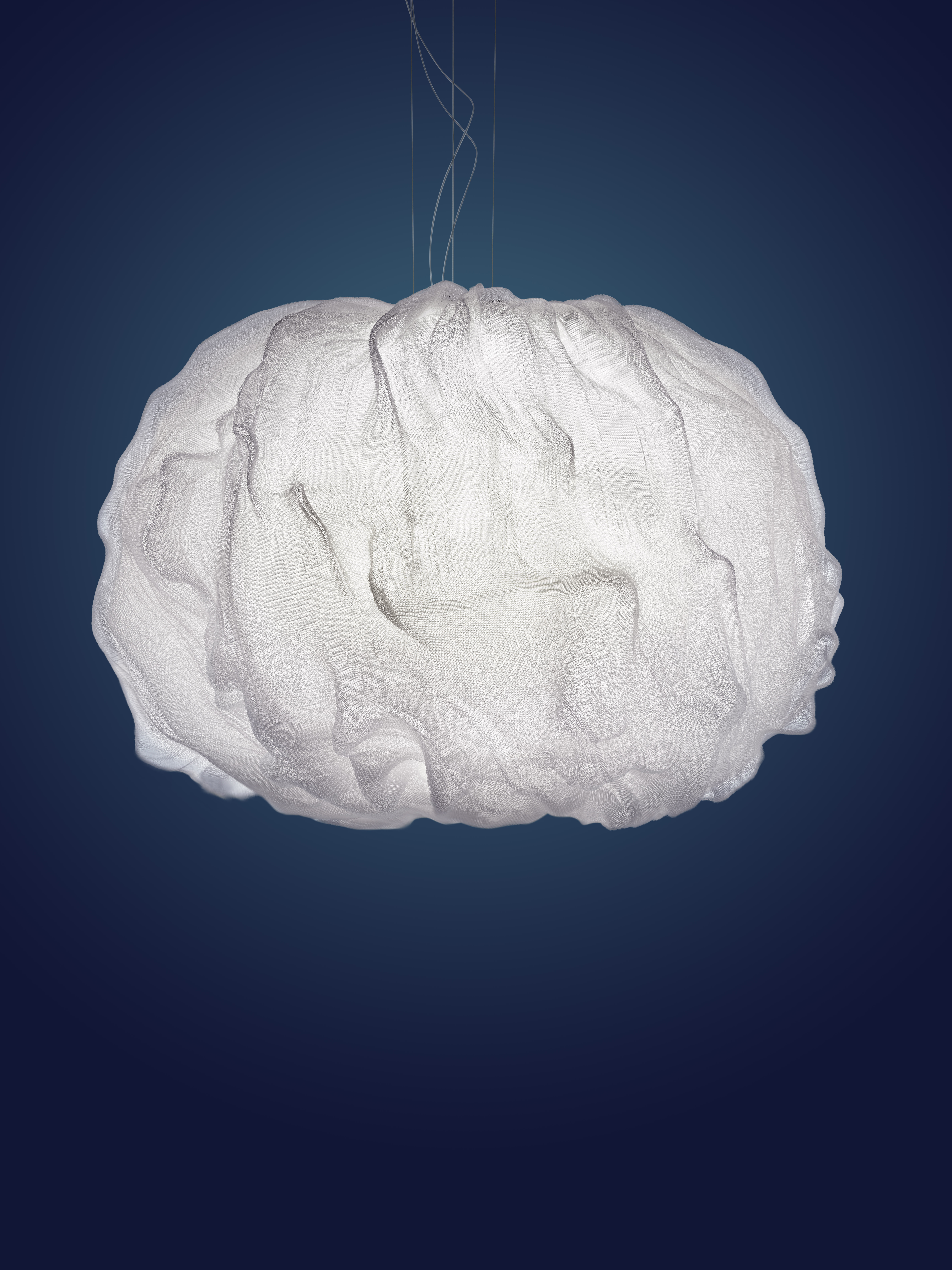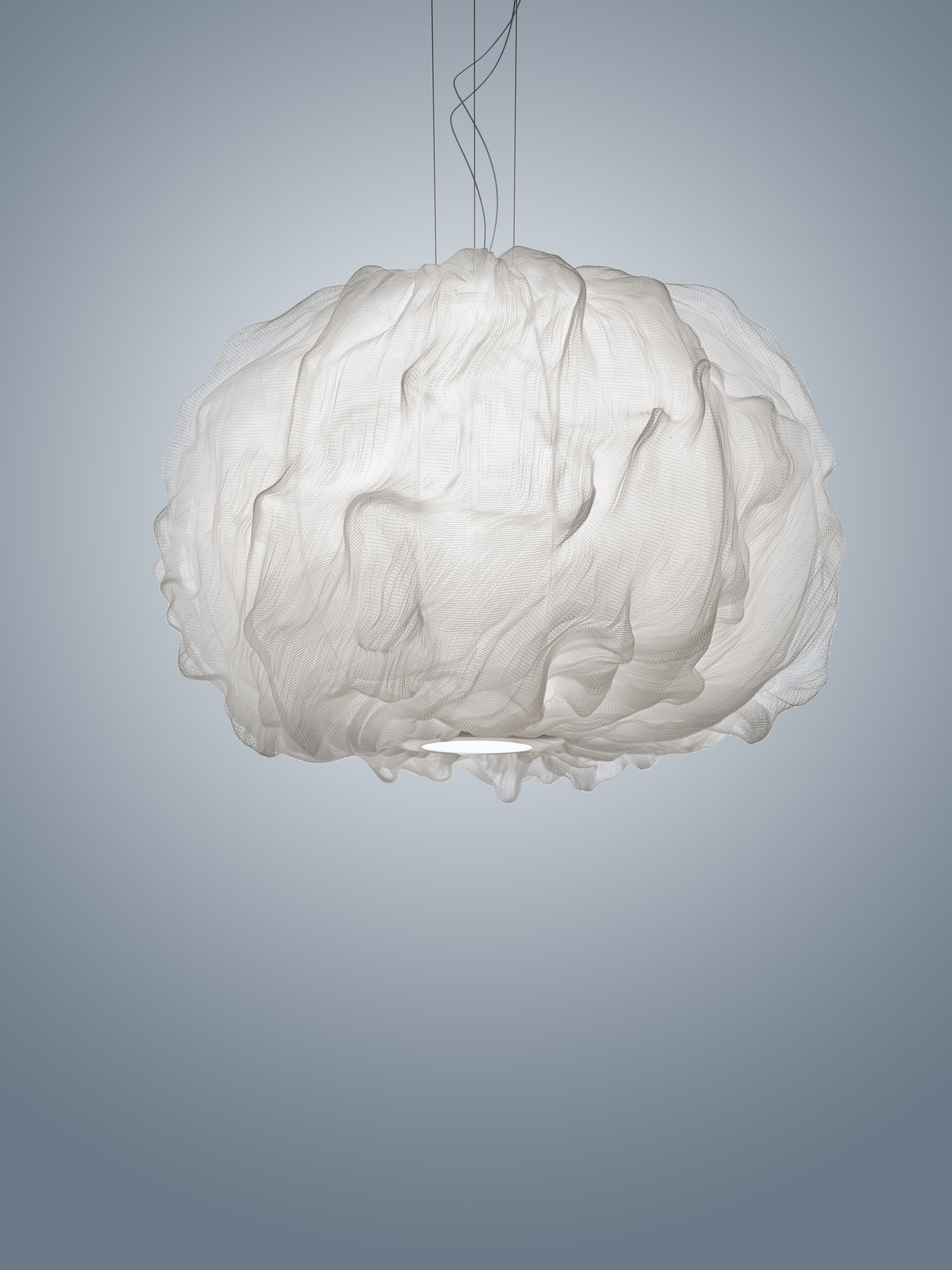 Het materiaal, een driedimensionaal technisch weefsel, wordt gemaakt met behulp van een speciale technologie die Foscarini voor het eerst in de verlichtingssector heeft toegepast. Het materiaal van Nuée moet met de hand worden getrokken en gevormd om de lamp zijn vorm te geven. Lichte en donkere zones komen tot leven, doorkruist door het licht om een poëtisch en intrigerend effect teweeg te brengen.