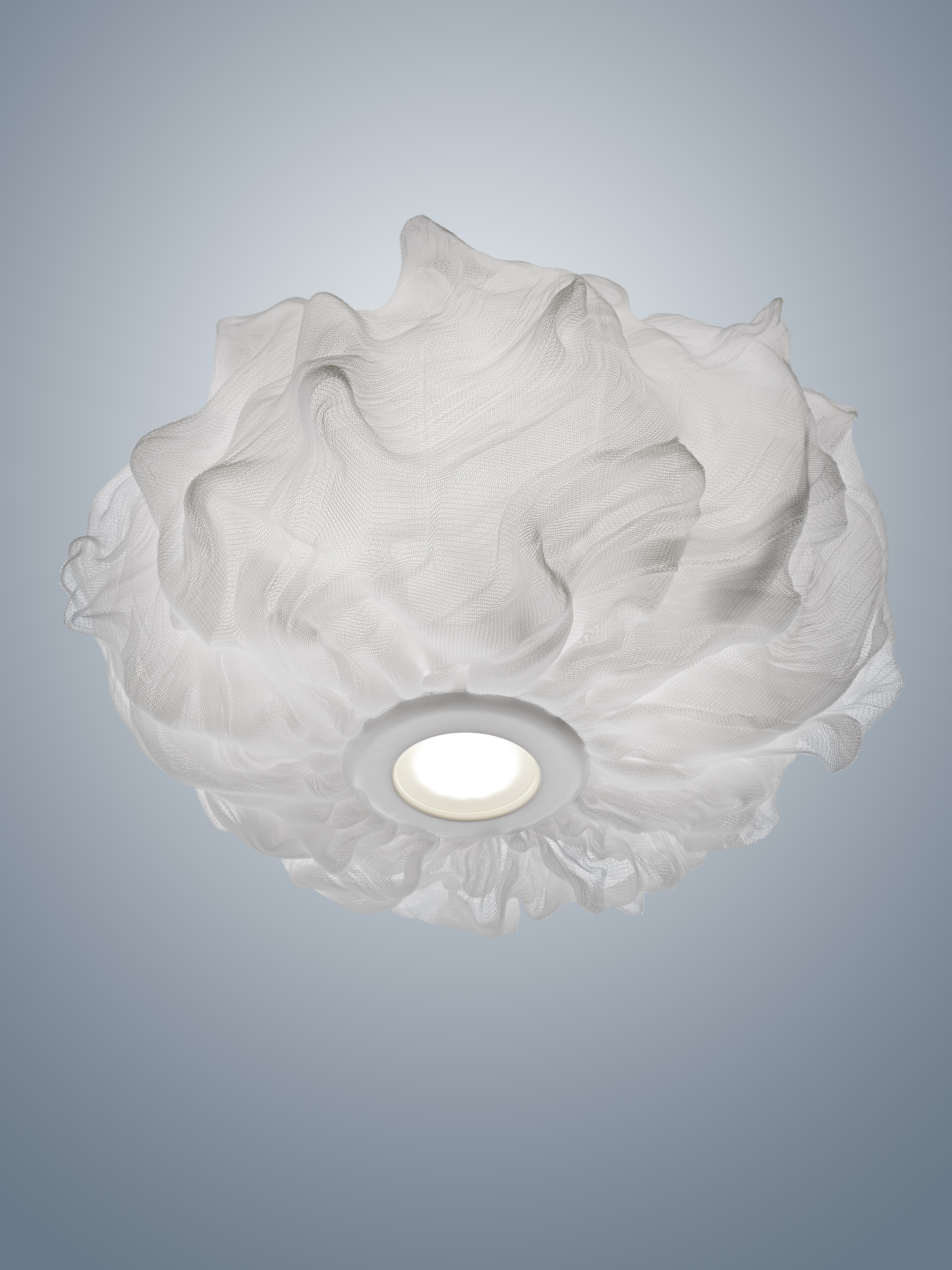 Nuée suggereert het idee van een zwerm vogels, die door de lucht trekt en zich verplaatst in indrukwekkende, abstracte vormen. Nuée is een object dat in beweging lijkt te zijn met verschillende lagen die elkaar overlappen en verschuiven. Het bijzondere, technische materiaal waarvan de lamp is gemaakt, geeft de nieuwe hanglamp een ongelooflijke visuele lichtheid en zorgt voor een uniek effect. Nuée is klaar om spectaculaire en complexe silhouetten aan te nemen en creëert een contrast tussen design en spontaniteit. De lichte, organische vorm van Nuée ontwikkelt zich vrij, op een manier die nooit identiek is: iedere lamp is een unieke creatie.