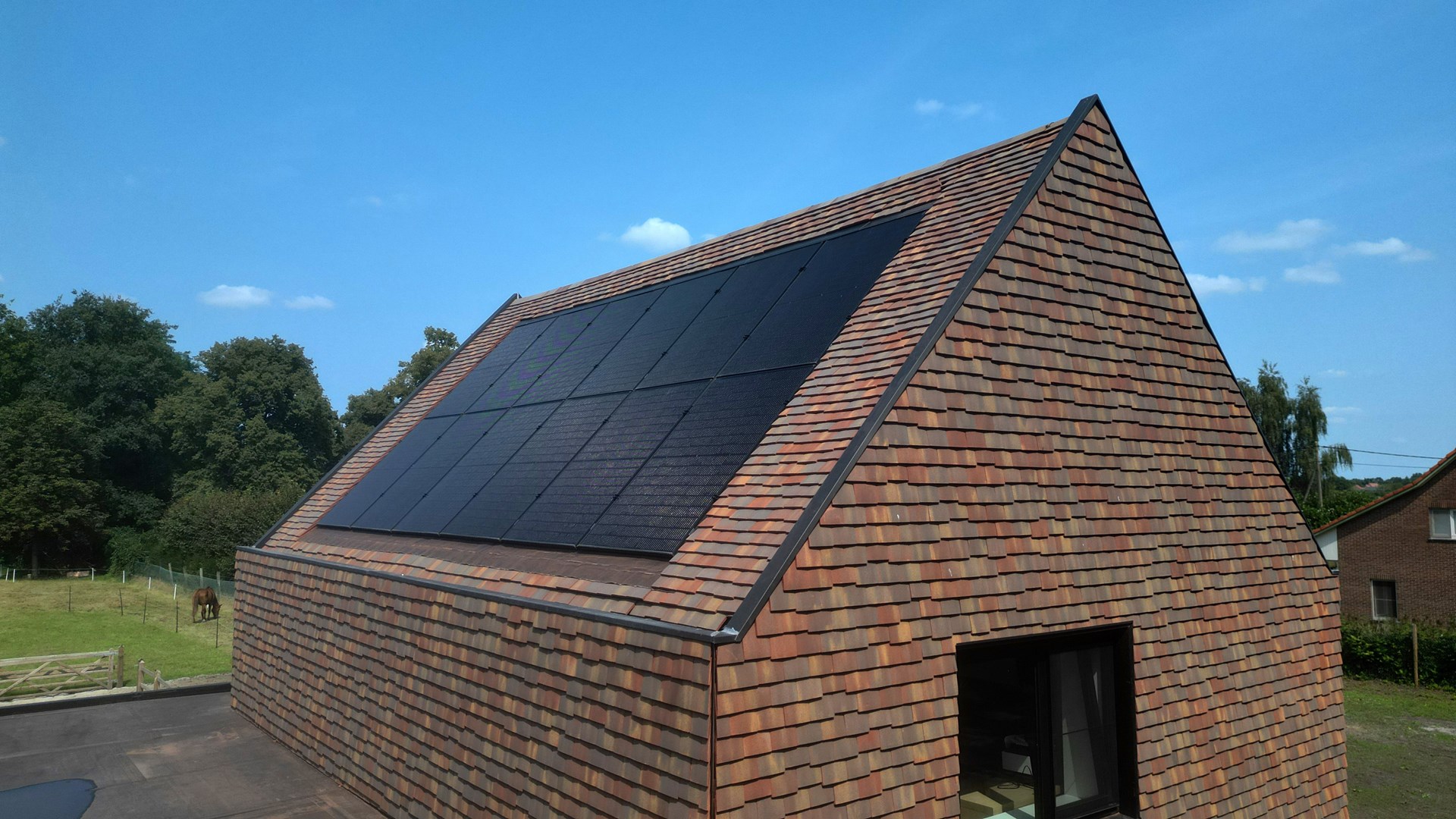 De zwarte kleur van de panelen contrasteert mooi met de herfsttinten van de dakpannen, maar blijft visueel ingetogen. Zo sluit de PV-installatie naadloos aan bij het totaalbeeld van de woning.
