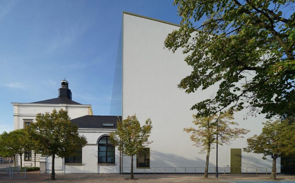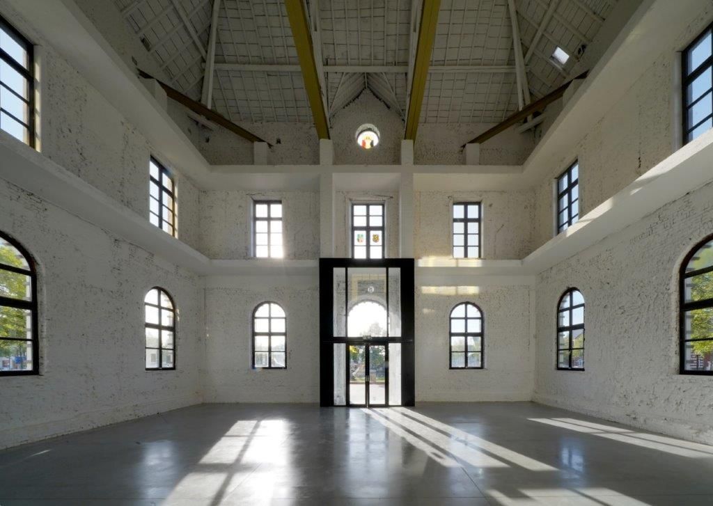 Het bouwteam kwam op de proppen met een slimme, vooruitstrevende oplossing. Het bestaande volume uit 1856 werd gepreserveerd, intern gestript en aangevuld met een achterliggende nieuwbouw. Van Roey vormde het voormalige gemeentehuis via enkele welgemikte ingrepen om tot een monumentale inkom-, tentoonstellings- en evenementenruimte met een historische grandeur. “Om alle binnenwanden en vloeren te kunnen uitbreken en een open geheel te kunnen creëren, hebben we de draagconstructie eerst nog versterkt met behulp van twee platte balken (zodat de muren opnieuw de vereiste stijfheid verkregen) en een extra staalconstructie in de dakspanten (wat een technisch huzarenstukje was, want ze is naar binnen gehesen met een zogeheten ‘evenaar’)”, vertelt senior projectleider Willy Withofs. “Voorts hebben we enkel nog een nieuwe vloer in polierbeton gelegd en alle wanden wit geschilderd. In combinatie met zwart schrijnwerk leidt dit tot een imposant geheel met een knappe, rustieke uitstraling.”
