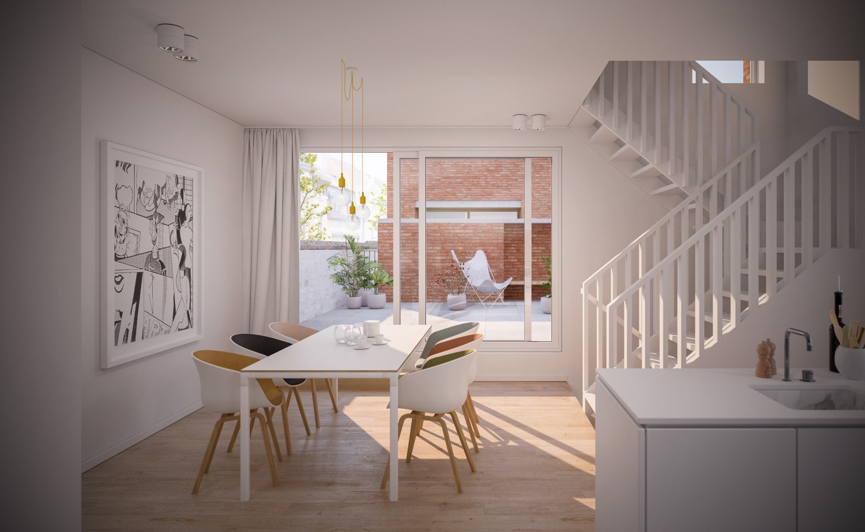 Op het niveau van het residentiële programma treffen we een 80-tal appartementen aan die verspreid liggen over twee gebouwen. Deze gebouwen delen telkens een langwerpige gemeenschappelijke tuin met een aantal grondgebonden woningen. Deze compacte terraswoningen hebben een ‘voordeur’ in de perimetermuur langs de straatzijde en verhogen opnieuw het contact met de omgeving.